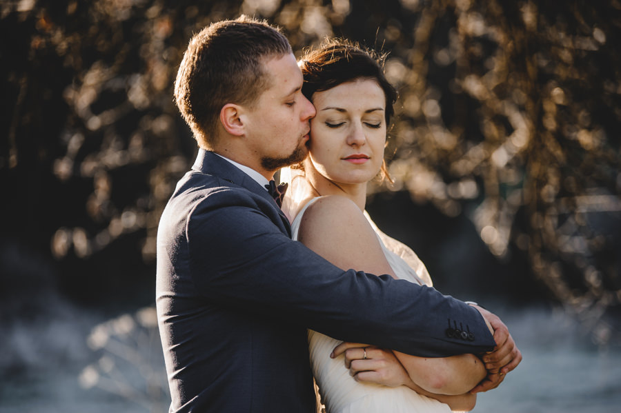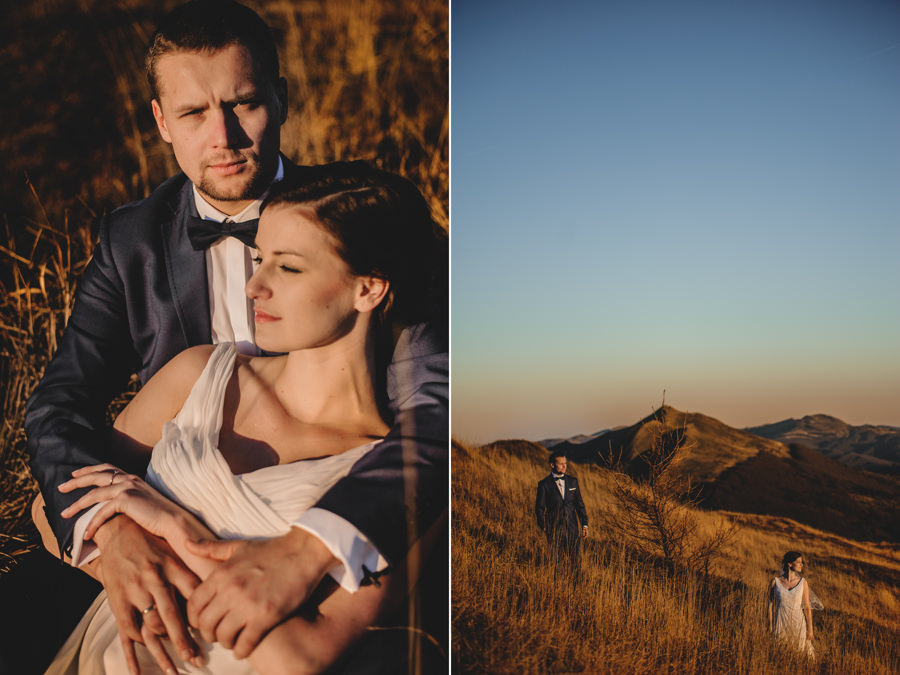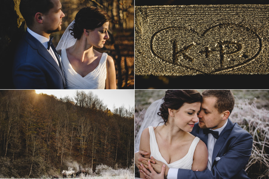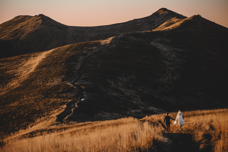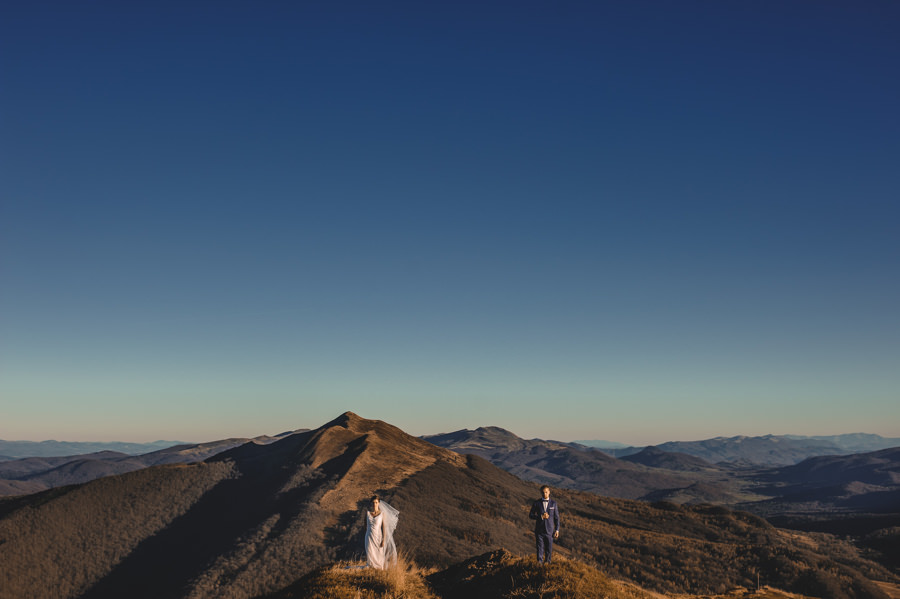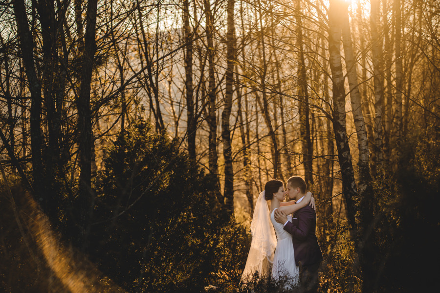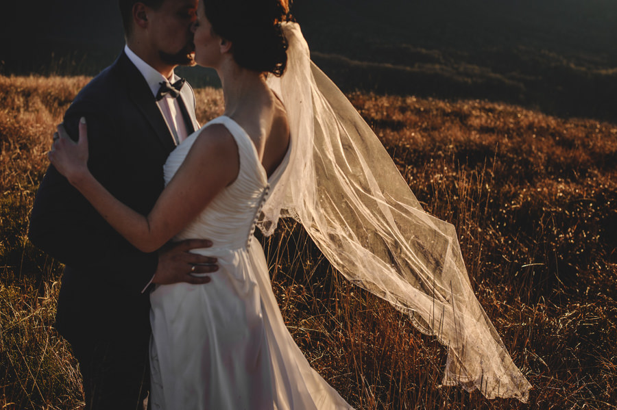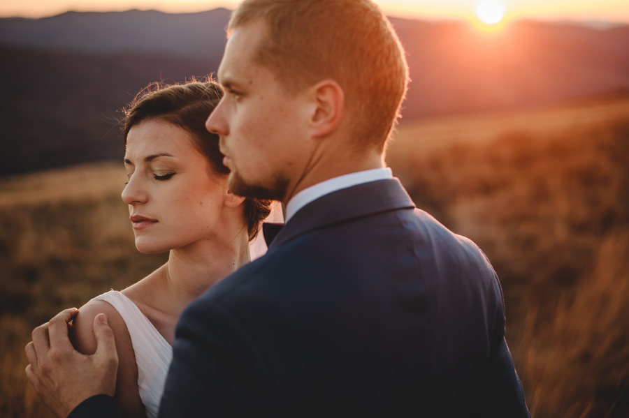 Dzisiejsza historia jest właśnie o takich ludziach. O ludziach pełnych przygody, szyderczego poczucia humoru i masy pozytywnej energii. O takich ludziach, z którymi wspólne, górskie włóczęgostwo powoduje żal, ze ta kolejna przygoda niebawem się skończy. Fotografując sesję plenerową w Bieszczadach miałem warunki, których można by tylko pozazdrościć. Otwarte przestrzenie Połoniny Wetlińskiej okraszone promieniami zachodzącego słońca, by rano pracować w zupełnie zjawiskowych warunkach. Szadź która nocą osadziła się na gałęziach drzew, dała istny spektakl świateł. Tutaj chylę ukłony do Karoliny i Piotrka, którzy w tych dość mocno niesprzyjających temperaturowo warunkach poświęcili się dla moich pomysłów. Pamiętajcie, że sukces udanej sesji ślubnej leży tak samo po „obu stronach aparatu” 😉