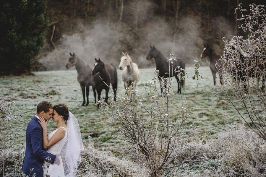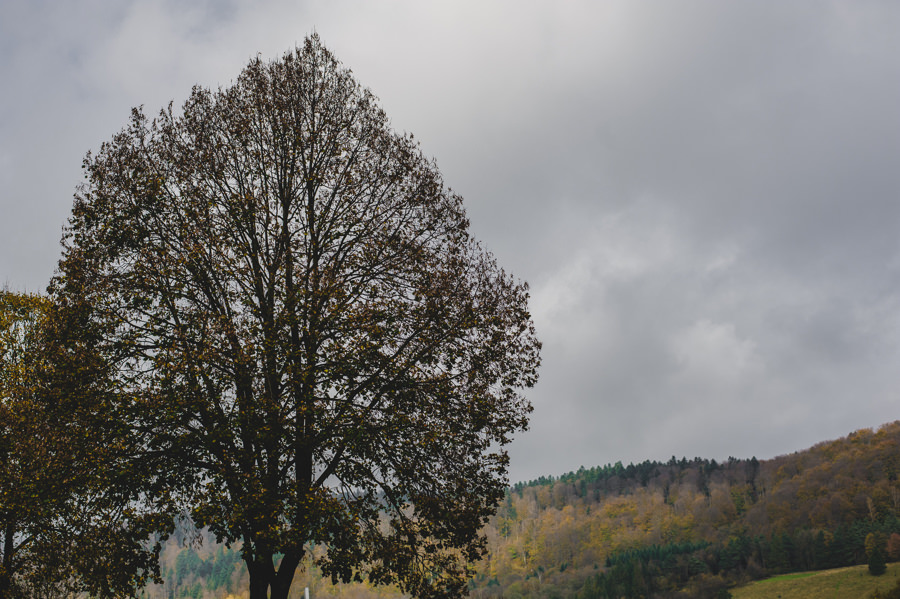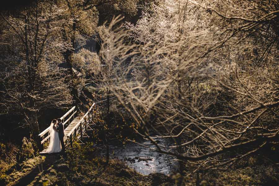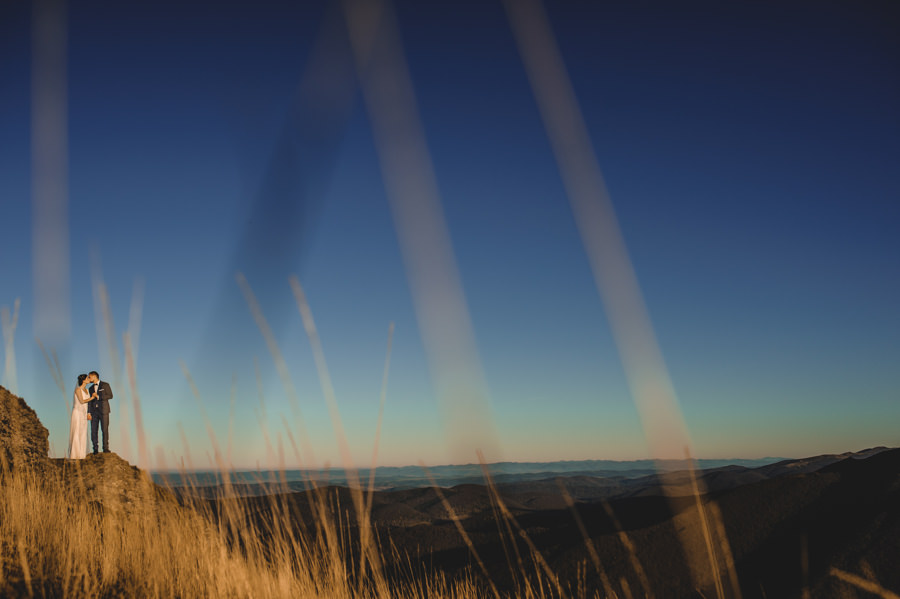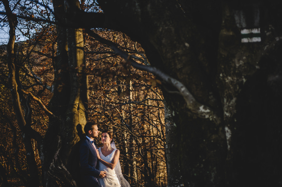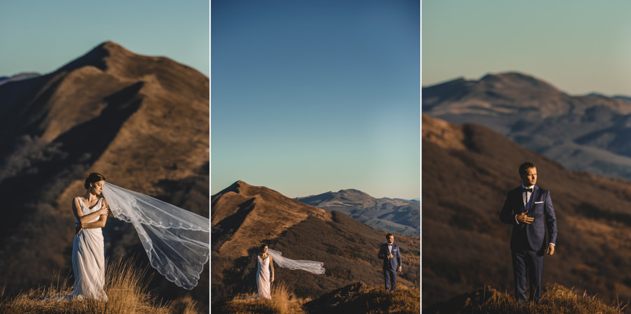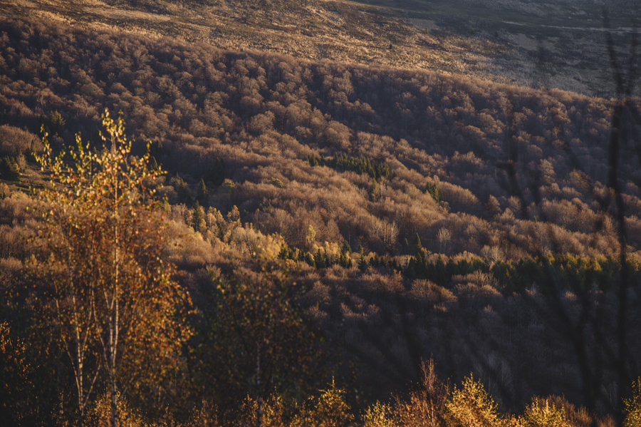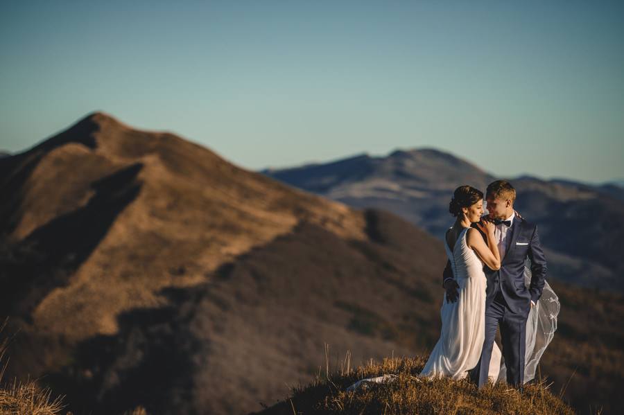 Dzisiejsza historia jest właśnie o takich ludziach. O ludziach pełnych przygody, szyderczego poczucia humoru i masy pozytywnej energii. O takich ludziach, z którymi wspólne, górskie włóczęgostwo powoduje żal, ze ta kolejna przygoda niebawem się skończy. Fotografując sesję plenerową w Bieszczadach miałem warunki, których można by tylko pozazdrościć. Otwarte przestrzenie Połoniny Wetlińskiej okraszone promieniami zachodzącego słońca, by rano pracować w zupełnie zjawiskowych warunkach. Szadź która nocą osadziła się na gałęziach drzew, dała istny spektakl świateł. Tutaj chylę ukłony do Karoliny i Piotrka, którzy w tych dość mocno niesprzyjających temperaturowo warunkach poświęcili się dla moich pomysłów. Pamiętajcie, że sukces udanej sesji ślubnej leży tak samo po „obu stronach aparatu” 😉