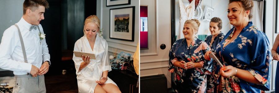 Fajny też był pomysł z prezentami dla orszaku. Każda osoba dostała spersonalizowane upominki. Dziewczyny miały lniane torby z nadrukowanym własnym imieniem, a w środku – wino i bransoletkę. A chłopaki – wygrawerowane piersióweczki. Klasa! Para młoda o sobie też nie zapomniała – oboje napisali do siebie list, który każde przeczytało dopiero w dniu ślubu. Nie wiem co w nim było, ale wywołał on duże poruszenie zarówno u Patrycji, jak i u Sebastiana. I to też było fajne.