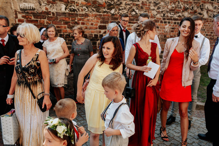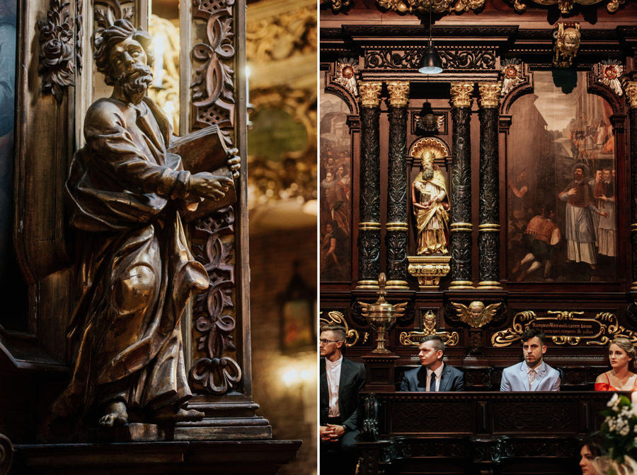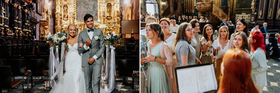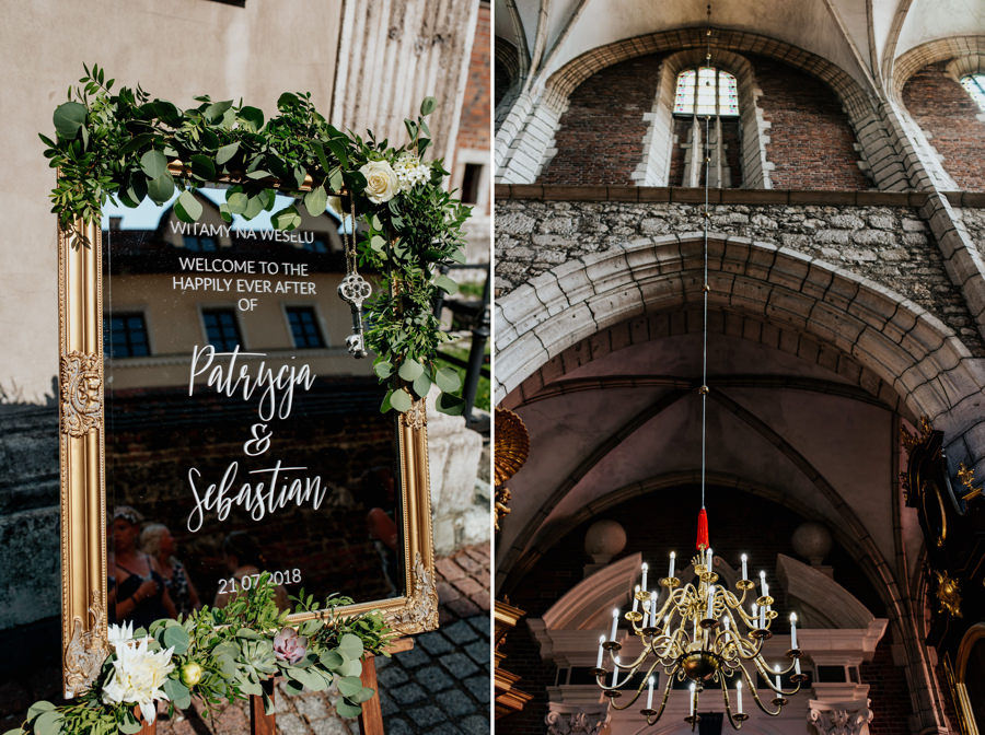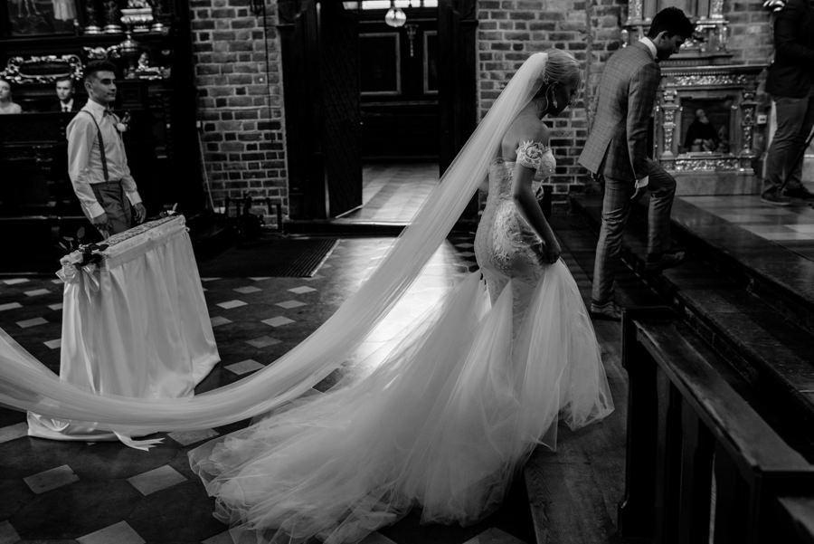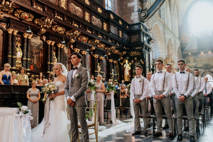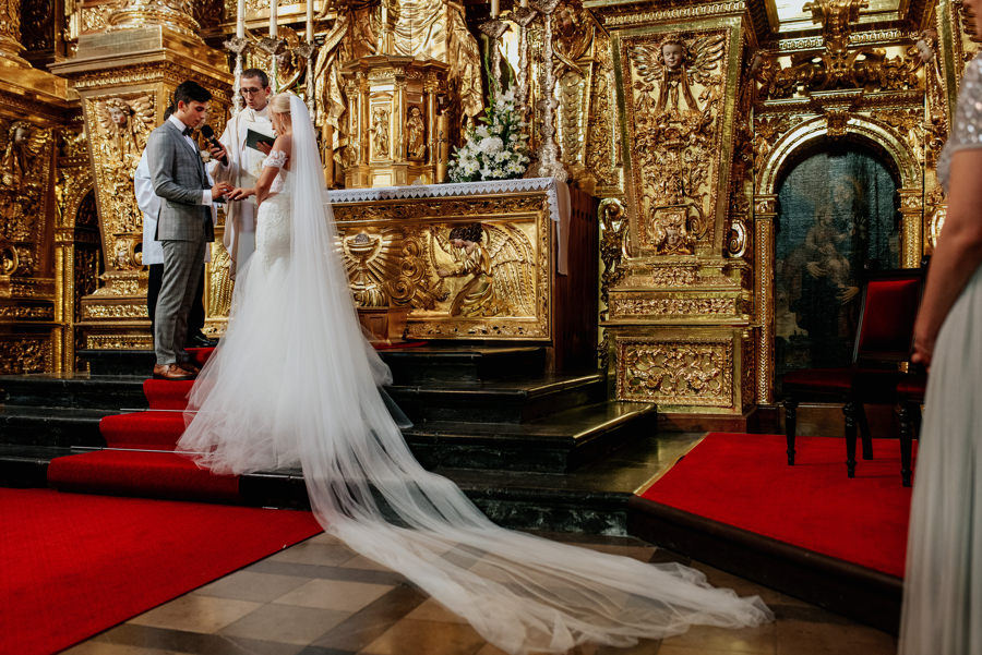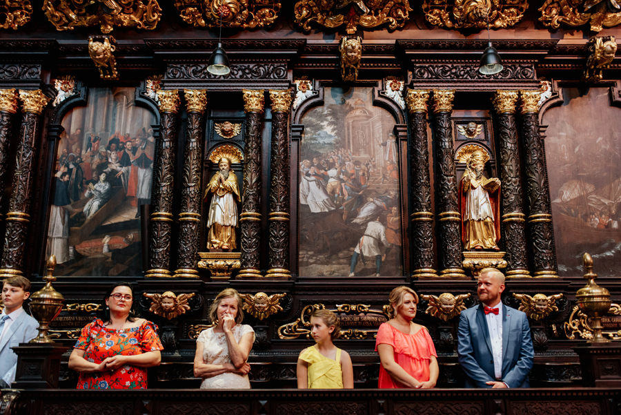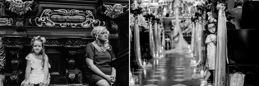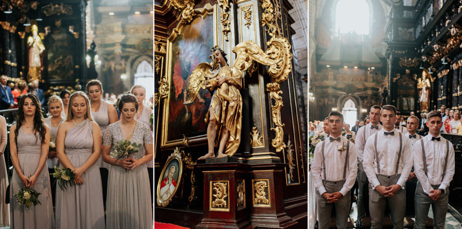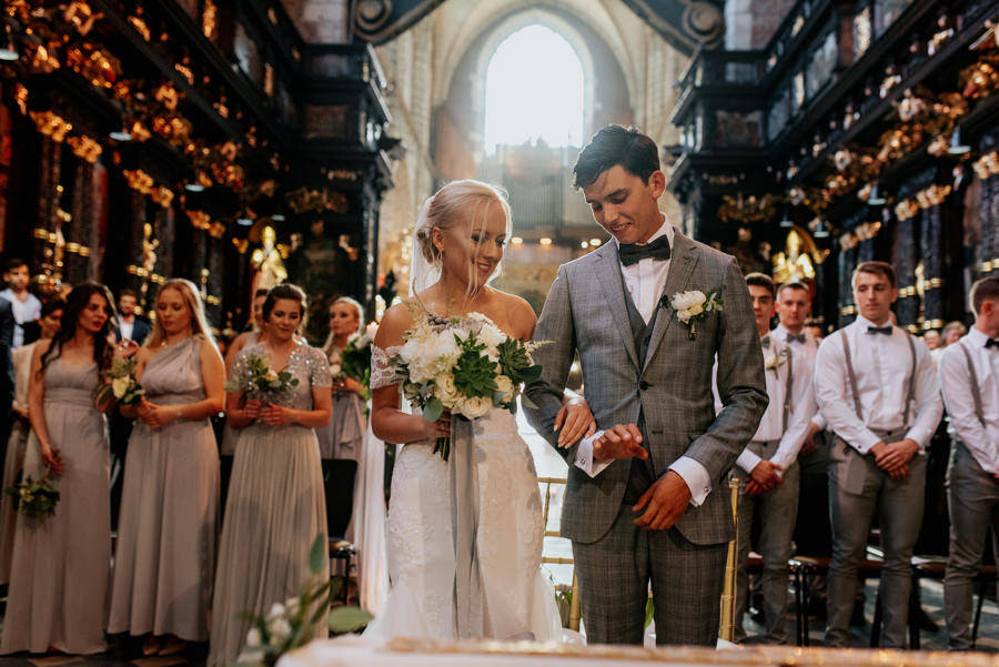 Jeśli myślicie, że wejście do kościoła może być zawsze takie samo – to zaraz Wam opowiem, co wydarzyło się na tym ślubie. Na początku orszaku pan młody szedł do ołtarza prowadzony przez mamę! Rzadkość, prawda? Następnie, po kolei, szły druhny i drużbowie. Pod koniec pojawiły się mali drużbowie z druhenkami i tablicą z napisem „nadchodzi panna młoda” i obrączkami w szklanym pudełku. A potem orszak zamknęła Patrycja, która szła do ołtarza z tatą. I wszystko to w majestatycznym zabytkowym kościele, z anielsko śpiewającym chórem w tle. Ceremonia jak wyreżyserowana do bajkowego filmu. Ale to wszystko było prawdziwe! Emocje także!