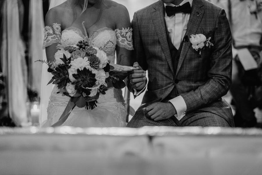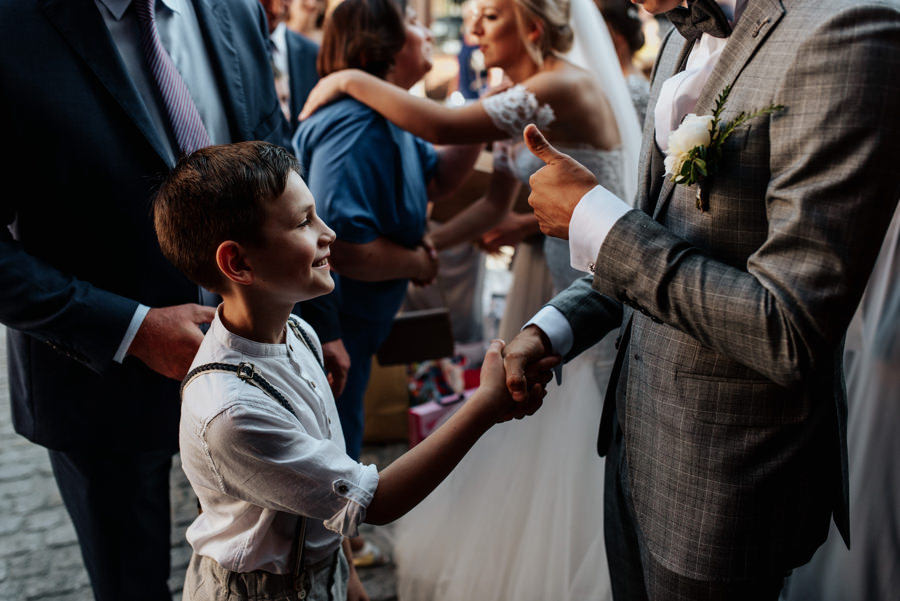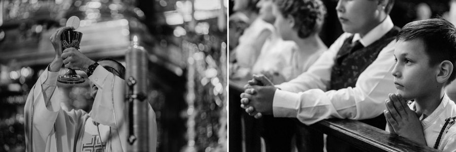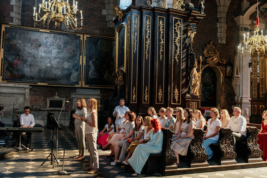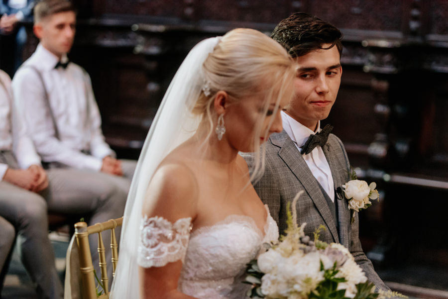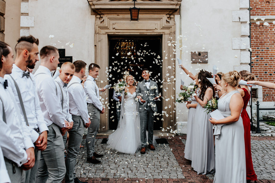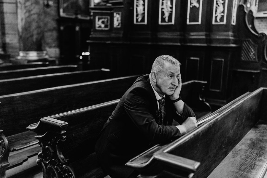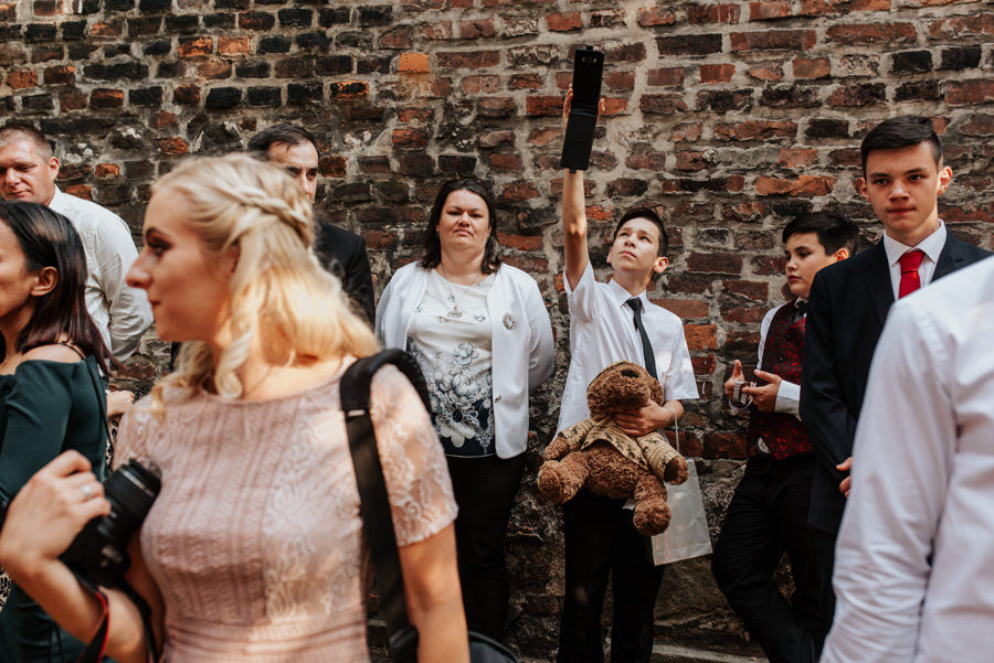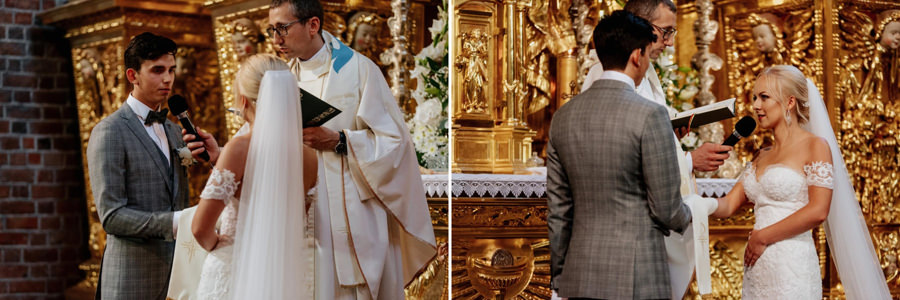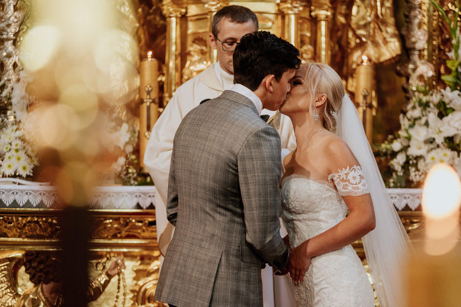 Jeśli myślicie, że wejście do kościoła może być zawsze takie samo – to zaraz Wam opowiem, co wydarzyło się na tym ślubie. Na początku orszaku pan młody szedł do ołtarza prowadzony przez mamę! Rzadkość, prawda? Następnie, po kolei, szły druhny i drużbowie. Pod koniec pojawiły się mali drużbowie z druhenkami i tablicą z napisem „nadchodzi panna młoda” i obrączkami w szklanym pudełku. A potem orszak zamknęła Patrycja, która szła do ołtarza z tatą. I wszystko to w majestatycznym zabytkowym kościele, z anielsko śpiewającym chórem w tle. Ceremonia jak wyreżyserowana do bajkowego filmu. Ale to wszystko było prawdziwe! Emocje także!