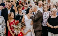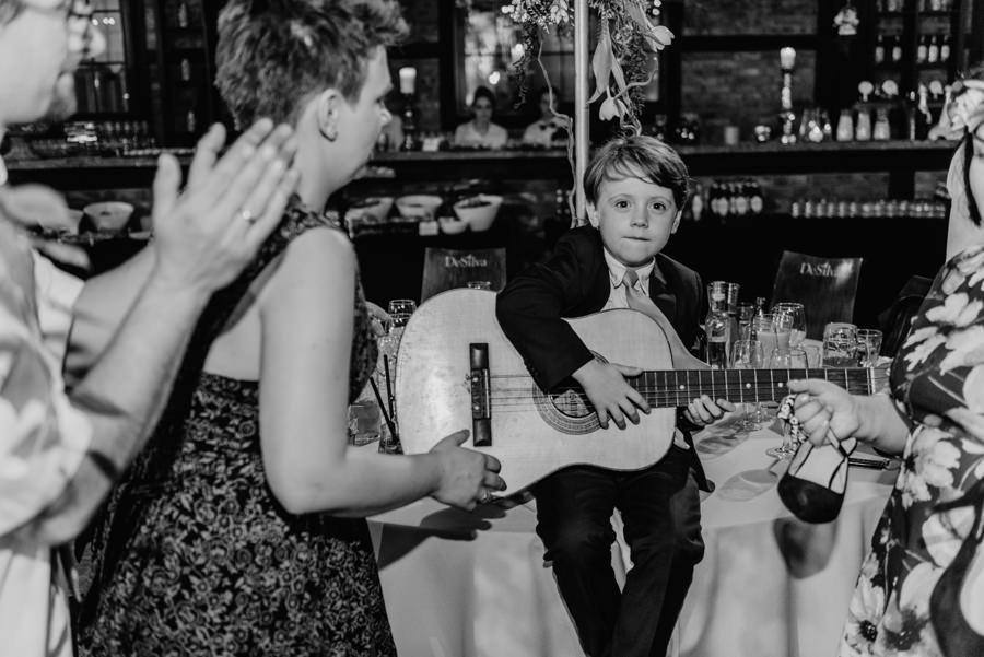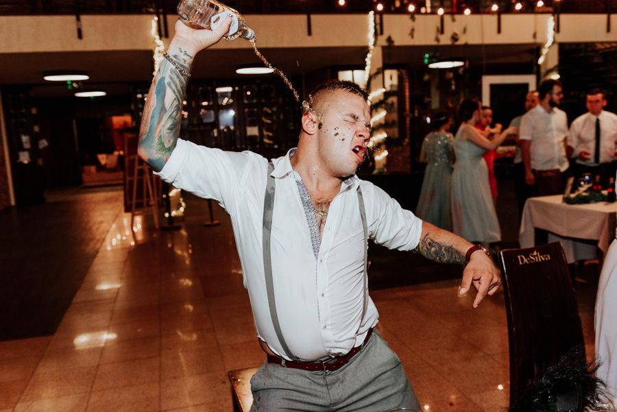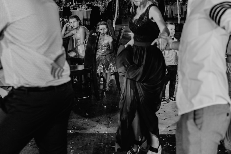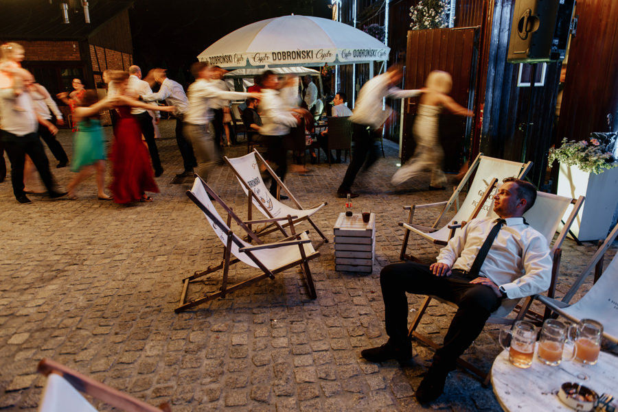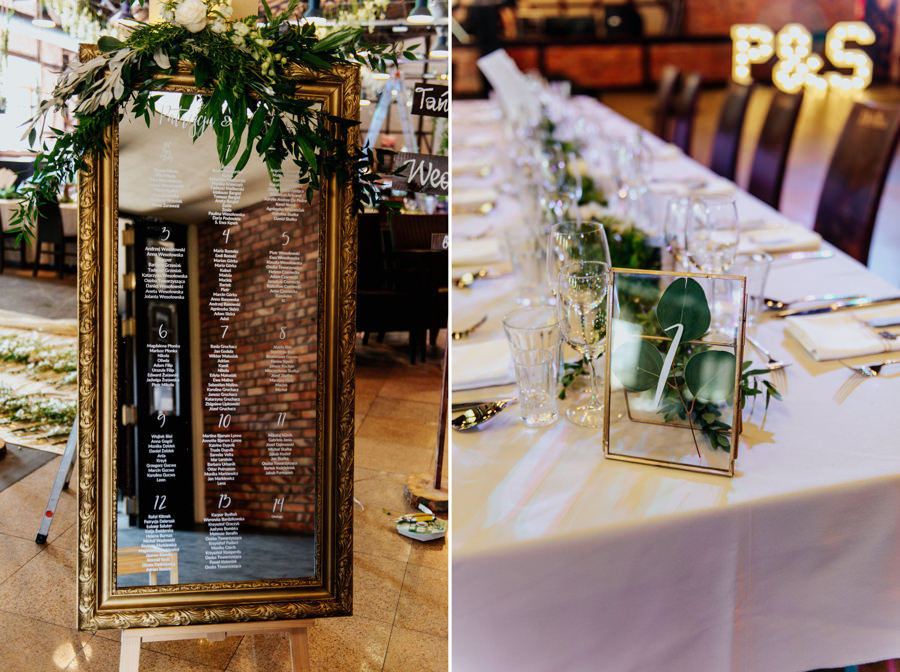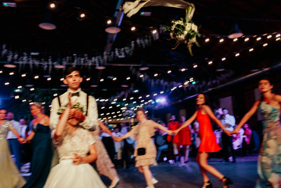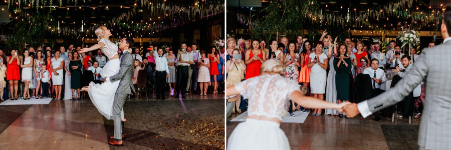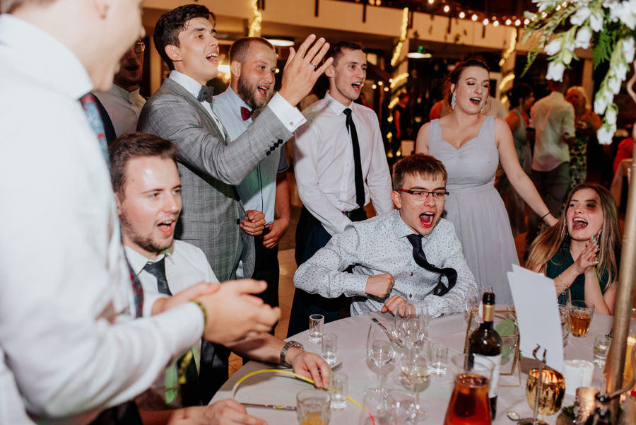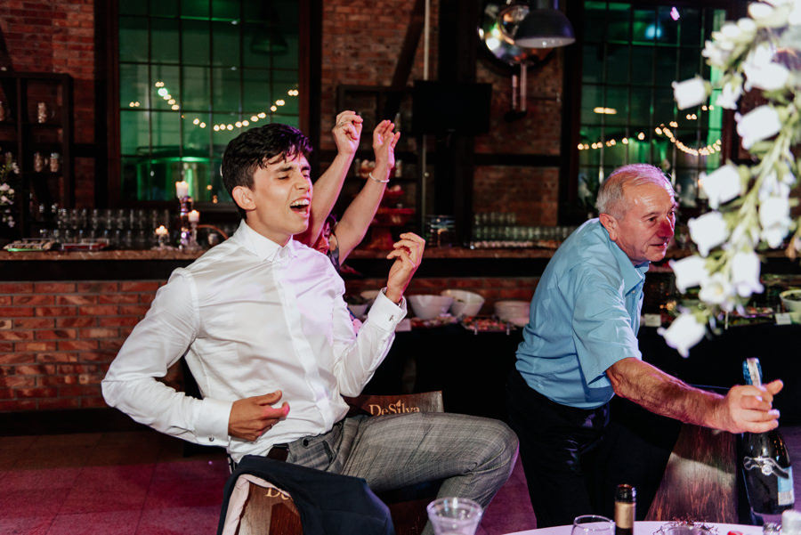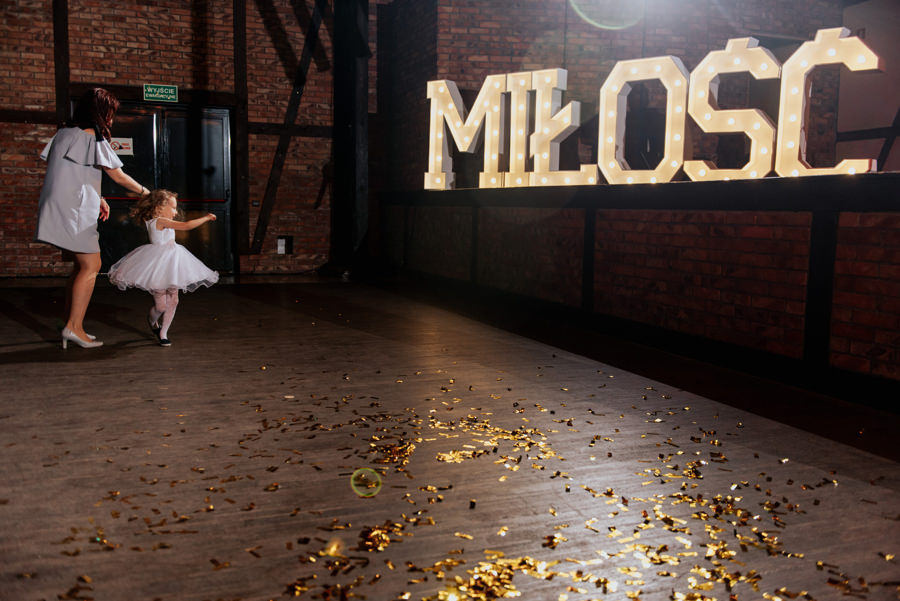 A to, co działo się w tej sali, to już była magia! Przestronne wnętrza zabytkowej hali, które same w sobie są mega klimatyczne – dodatkowo zyskały jeszcze więcej stylu, gdy weszła tu pani Bogna z Paper Flower Art. Mnóstwo kwiatów, nie tylko na stołach, ale też nad głowami gości. Wielka zielona ścianka z bukszpanu za parą młodą z nietypowym napisem „It was always you”. I to odważne połączenie złota i srebra z zielenią, której tu absolutnie było pełno. Jeśli kiedykolwiek sądziłem, że mało rzeczy może mnie już zaskoczyć, to właśnie ślub Patrycji i Sebastiana pokazał mi, że się mylę. I dobrze. Bo fajnie widzieć pary, którym się chce, które mają pomysł na swój ślub i nie boją się go zrealizować. I dobrze jest potem widzieć jak cieszą się tym dniem. Szaleją na parkiecie, bo mają super zespół i świetną ekipę gości, która z nimi daje czadu!