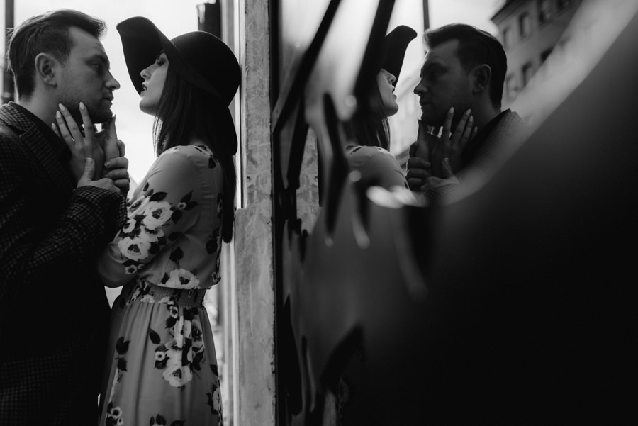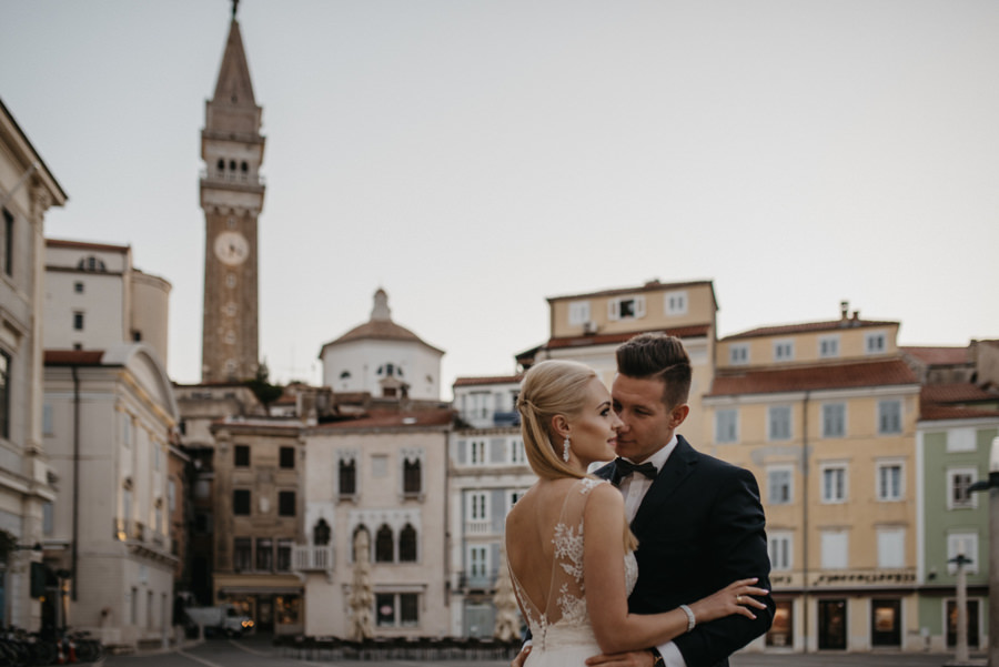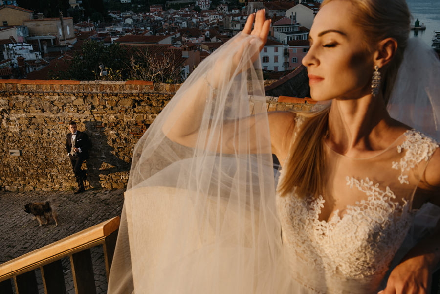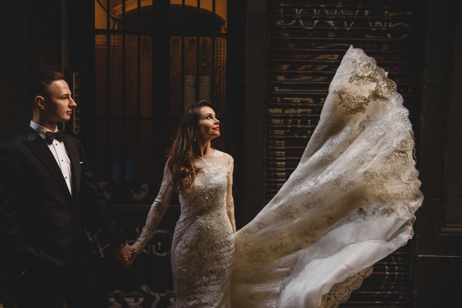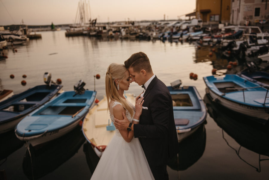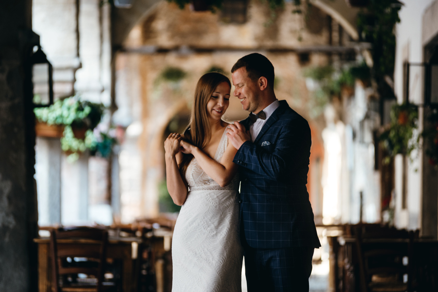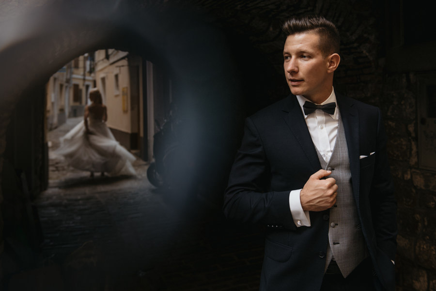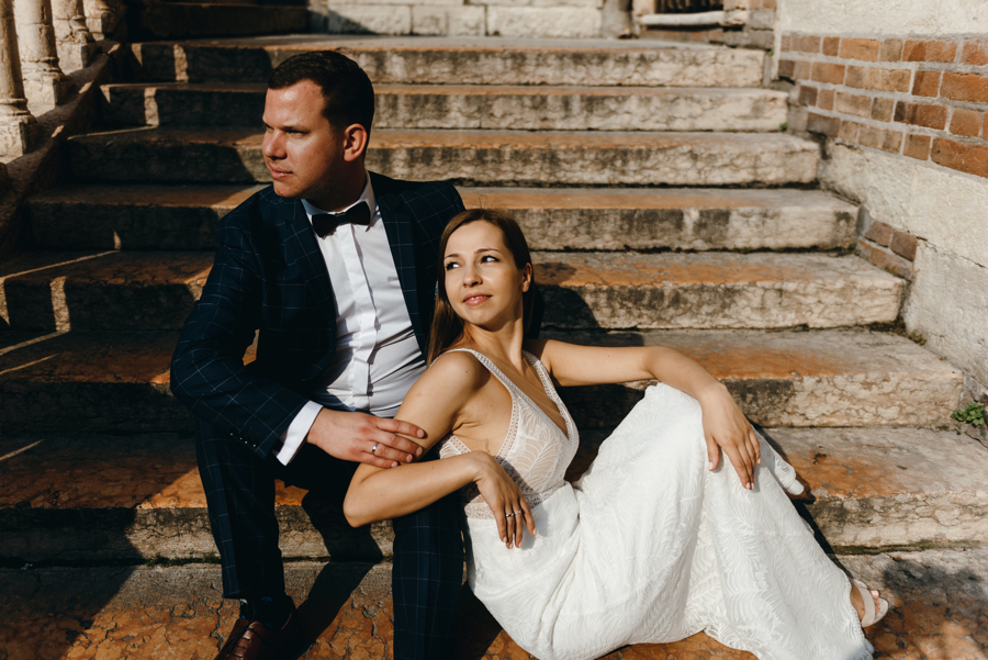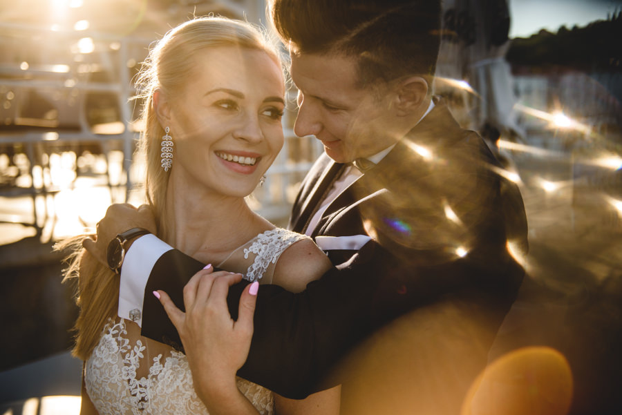 Rzym ma Koloseum, Mediolan stoi modą. Jest i Wenecja, która zdecydowanie „płynie” na fali popularności. Dryfujące na wodzie gondole, przepastny Canale Grande, praktycznie niemożliwa do zliczenia ilość mostów i mosteczków, urokliwe fasady budynków, uliczki, placyki, kościoły. Sesja za granicą w miejscu tak intensywnie naładowanym emocjami jest skazana na sukces. Dlatego pary tak chętnie wybierają Wenecję jako tło zdjęciowe. Chociaż żyliśmy w przekonaniu, że zawodowo czujemy się lepiej na łonie natury, pobyt w słynnym mieście na wodzie zmienił naszą optykę. To fenomenalne uczucie, kiedy na własnej skórze czujesz magię miejsca. Ucinasz pogawędkę z mieszkańcami, spijasz mocne jak diabli espresso w małej kawiarni i realnie stajesz się uczestnikiem toczącego się tam życia. Równie wspaniałe jest to, że sesję za granicą masz okazję popełnić z parą fotografów, którzy tym razem stają po drugiej stronie obiektywu. Iwona i Michał doskonale zdawali sobie sprawę z tego, co będzie dobrze prezentowało się na zdjęciach, a co po prostu nie zda egzaminu. Z bohaterami tej zagranicznej sesji ślubnej mogliśmy kraść przysłowiowe konie oraz stworzyć fotografie o zupełnie nowej jakości wizualnej. Oczywiście, nie zabrakło kultowych gondoli i romantycznych uliczek. Jednak nie one „grały tu pierwsze skrzypce”. Dla nas najistotniejsze były nieoczywiste, niebanalne kadry, które z powodzeniem udało nam się uchwycić. Nieco impresjonistyczny klimat, Wenecja absolutnie wyrwana z kontekstu, bohaterowie jak ulał pasujący do scenerii. W przypadku tej sesji ślubnej za granicą zgadzało się wszystko!