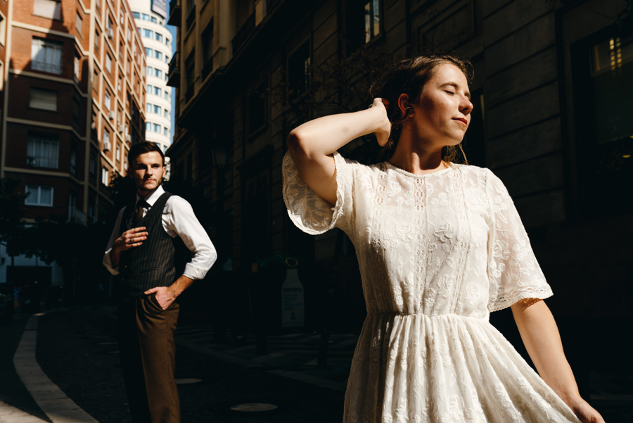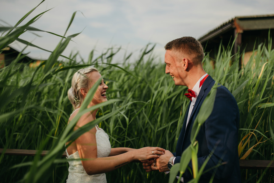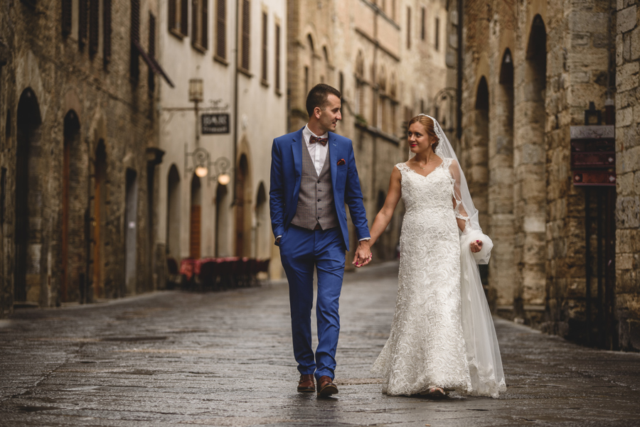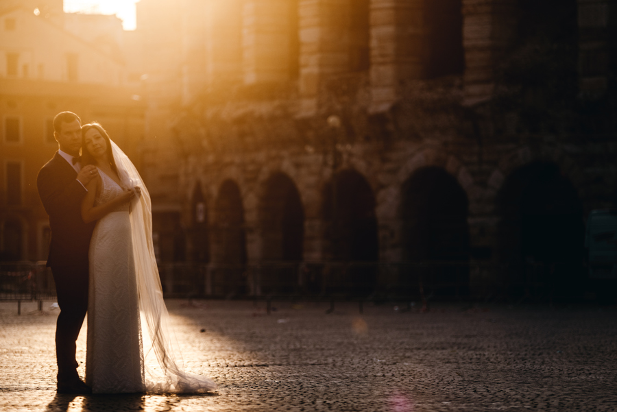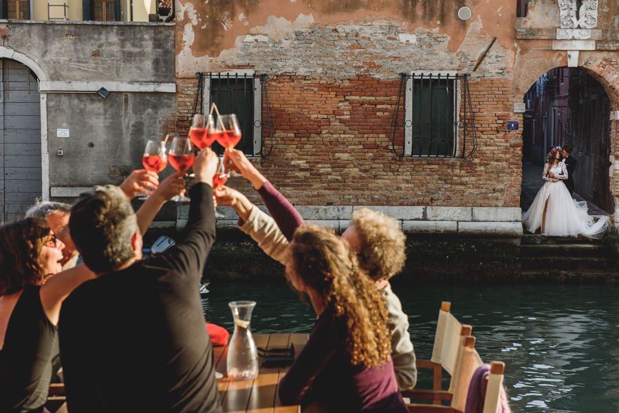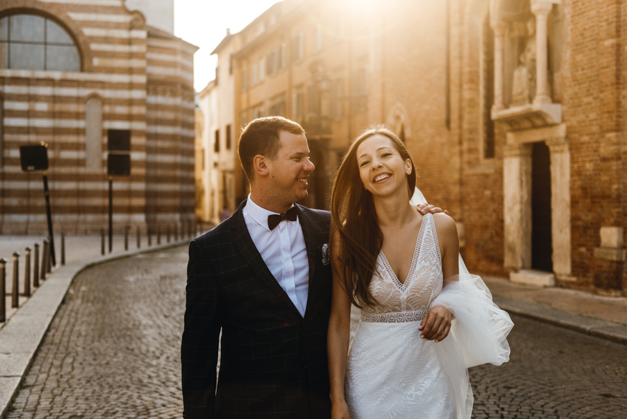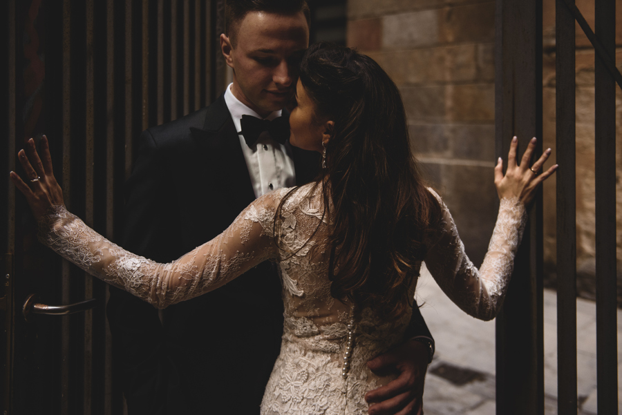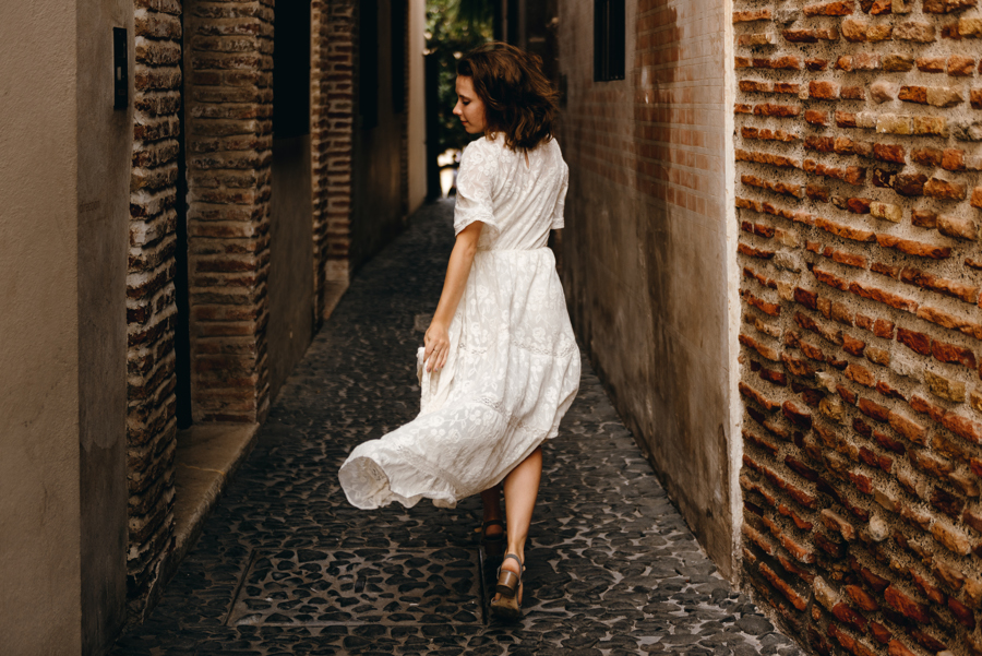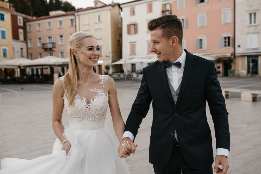 Rzym ma Koloseum, Mediolan stoi modą. Jest i Wenecja, która zdecydowanie „płynie” na fali popularności. Dryfujące na wodzie gondole, przepastny Canale Grande, praktycznie niemożliwa do zliczenia ilość mostów i mosteczków, urokliwe fasady budynków, uliczki, placyki, kościoły. Sesja za granicą w miejscu tak intensywnie naładowanym emocjami jest skazana na sukces. Dlatego pary tak chętnie wybierają Wenecję jako tło zdjęciowe. Chociaż żyliśmy w przekonaniu, że zawodowo czujemy się lepiej na łonie natury, pobyt w słynnym mieście na wodzie zmienił naszą optykę. To fenomenalne uczucie, kiedy na własnej skórze czujesz magię miejsca. Ucinasz pogawędkę z mieszkańcami, spijasz mocne jak diabli espresso w małej kawiarni i realnie stajesz się uczestnikiem toczącego się tam życia. Równie wspaniałe jest to, że sesję za granicą masz okazję popełnić z parą fotografów, którzy tym razem stają po drugiej stronie obiektywu. Iwona i Michał doskonale zdawali sobie sprawę z tego, co będzie dobrze prezentowało się na zdjęciach, a co po prostu nie zda egzaminu. Z bohaterami tej zagranicznej sesji ślubnej mogliśmy kraść przysłowiowe konie oraz stworzyć fotografie o zupełnie nowej jakości wizualnej. Oczywiście, nie zabrakło kultowych gondoli i romantycznych uliczek. Jednak nie one „grały tu pierwsze skrzypce”. Dla nas najistotniejsze były nieoczywiste, niebanalne kadry, które z powodzeniem udało nam się uchwycić. Nieco impresjonistyczny klimat, Wenecja absolutnie wyrwana z kontekstu, bohaterowie jak ulał pasujący do scenerii. W przypadku tej sesji ślubnej za granicą zgadzało się wszystko!