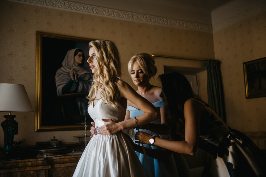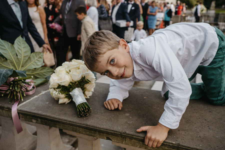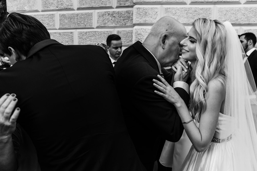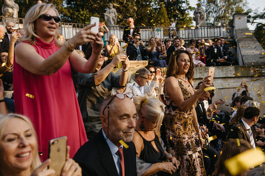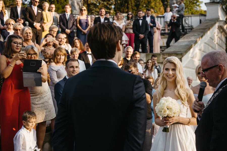 Zuza szła na miejsce ceremonii pośród tłumu turystów, którzy robili jej zdjęcia. W tle słychać było muzykę kwartetu wymieszaną z głosami zachwytów gości i dźwiękami migawek telefonów. Tuż za panną młodą kroczyła świadkowa trzymając welon. Pan młody już czekał na Zuzę. Wszystko wyglądało bardzo wytwornie. I trochę jak gdyby był to plan filmowy. Tak to wszystko było doskonałe. Cały anturaż, miejsce, muzyka, ciepłe popołudniowe słońce, sprawiało niesamowite wrażenie. Trzeba tutaj dodać, że wszystko było perfekcyjnie zorganizowane i skoordynowane przez Ewę i Zuzannę – weddingplanerki z  Krainy Ślubów. Czujne oko z pewnością wypatrzy również filmowców, z jednej z najbardziej renomowanych polskich firm – MPSTUDIOS, z którymi współpracuje się wyśmienicie! P