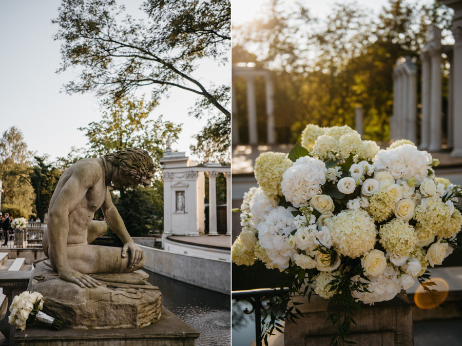 Ceremonia odbyła się w niezwykłym miejscu. Amfiteatr w Łazienkach był idealną przestrzenią na ślub plenerowy. Pełen zieleni drzew, na których tle wyłaniały się jasne, stylizowane na starożytne kolumny. Dodatek ogromnej ilości kwiatów tuż przy miejscu ceremonii był doskonałym pomysłem. Goście czekali na rozpoczęcie ślubu siedząc na ławkach amfiteatru. A pośród nich nie mogło zabraknąć także dwóch uroczych piesków panny młodej.