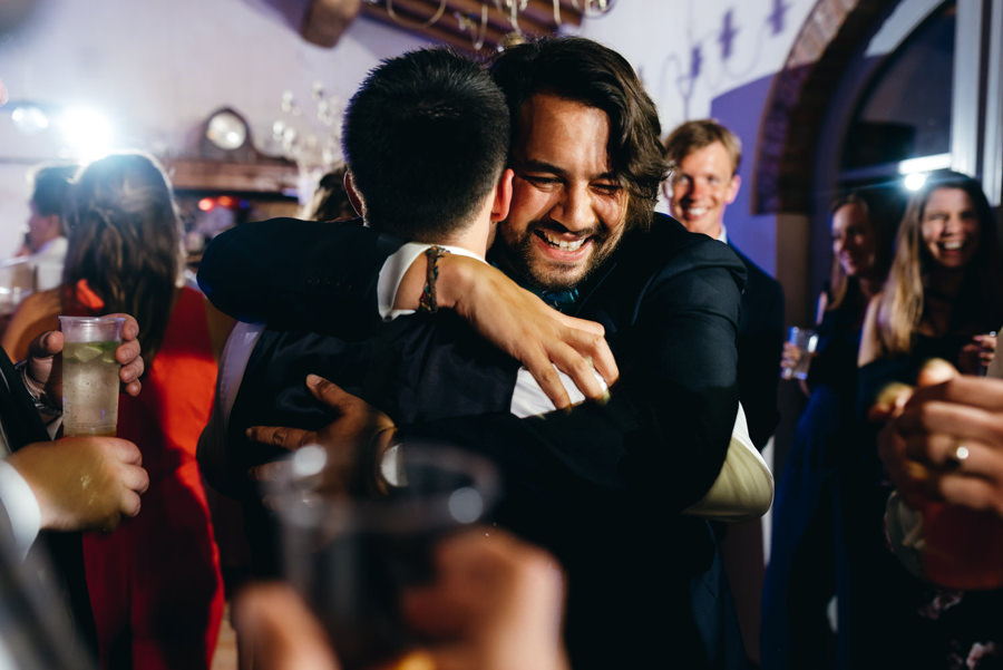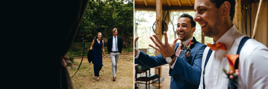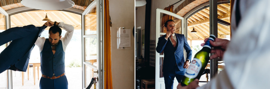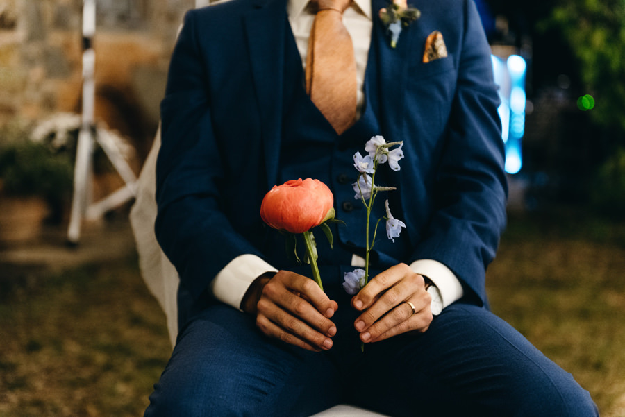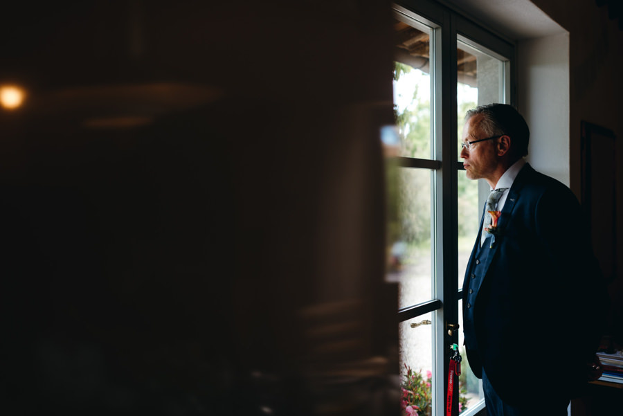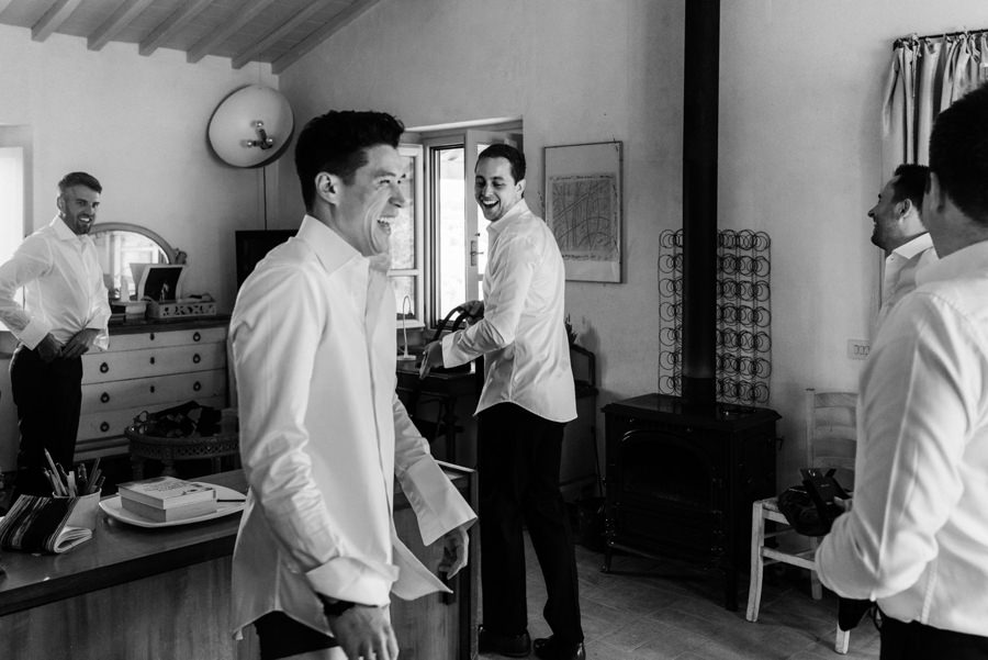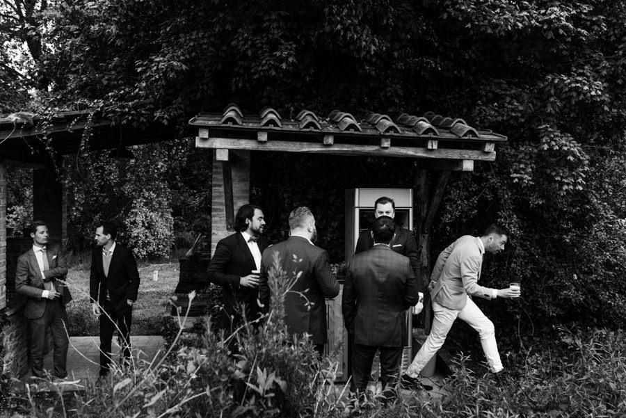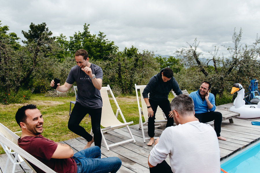 Panowie też nie mieli gorzej. Na zacienionym tarasie z widokami na okolicę pili zimne piwo i czekali do ostatniego momentu, by móc się ubrać. Sprzyjać temu zaczęła aura na zewnątrz – przyszło ochłodzenie i garnitury nie wydawały się już być szalonym pomysłem jak wtedy, gdy paliło toskańskie słońce.