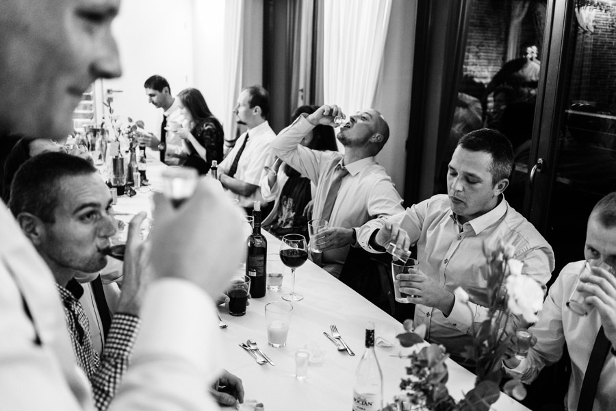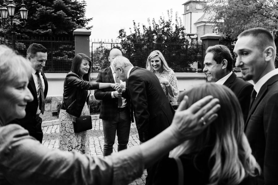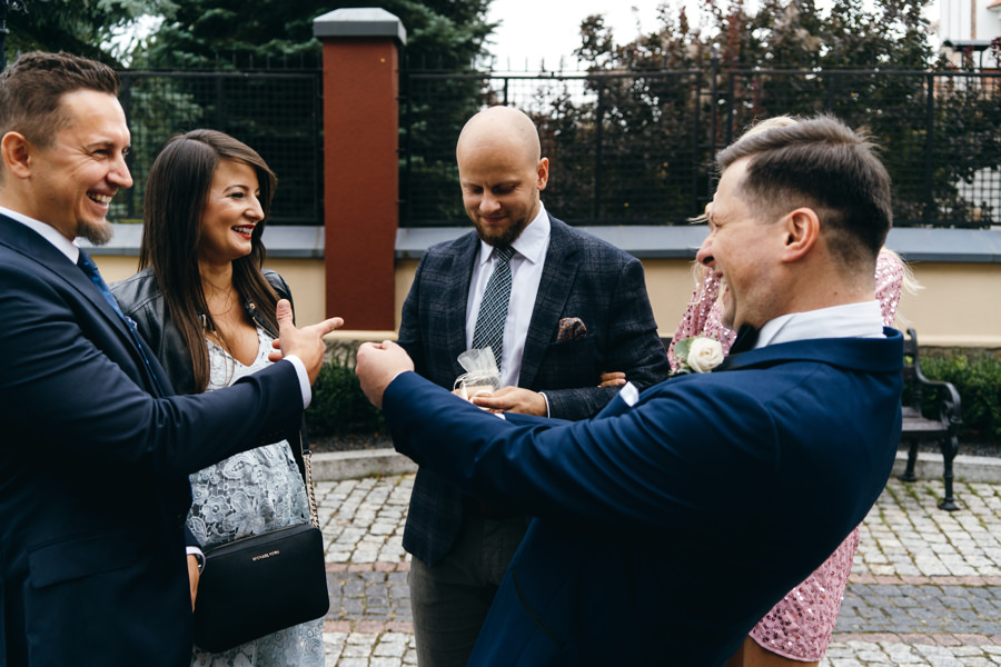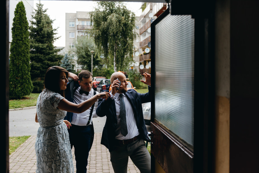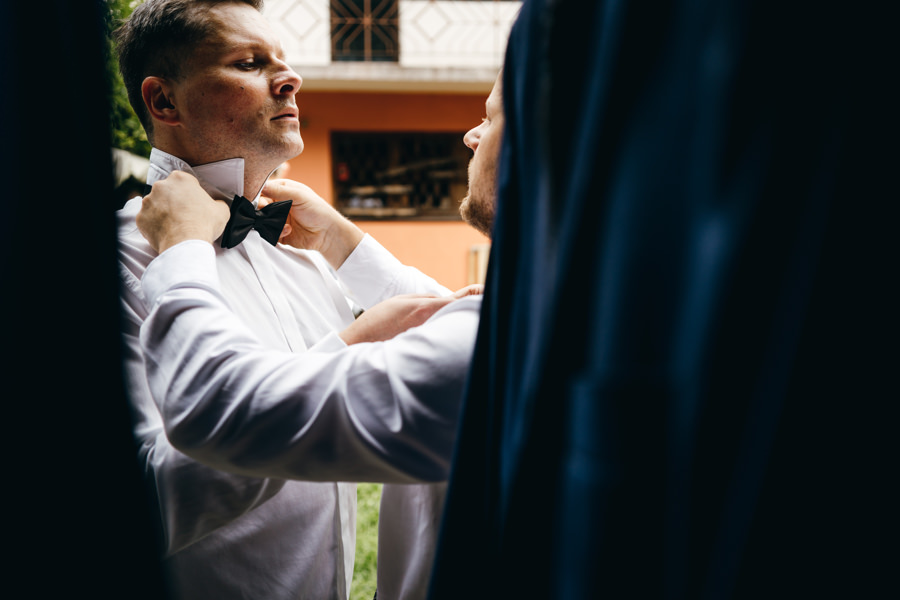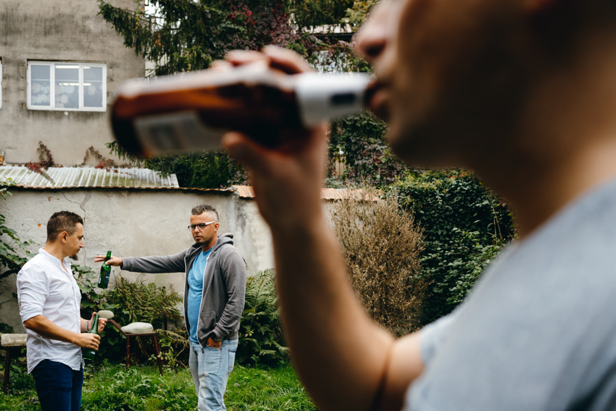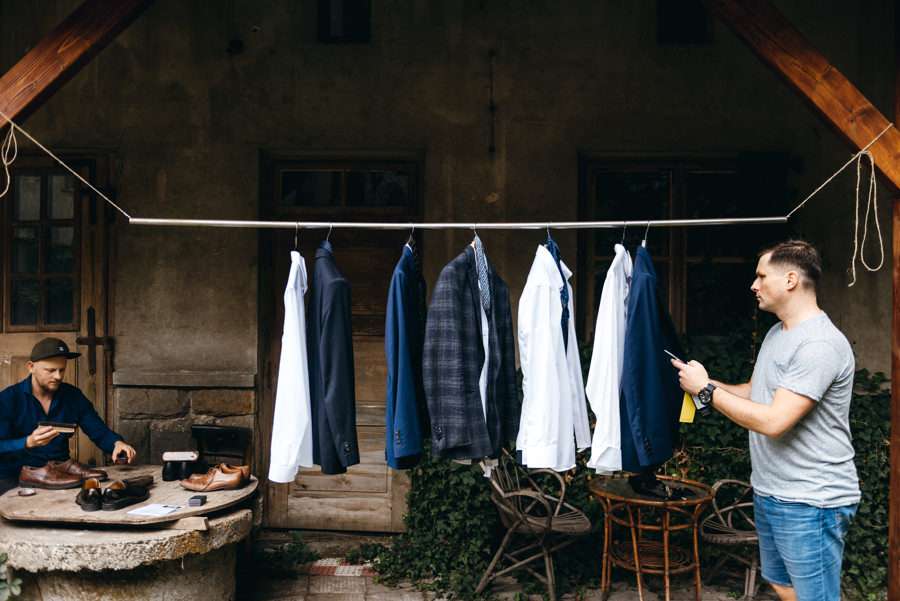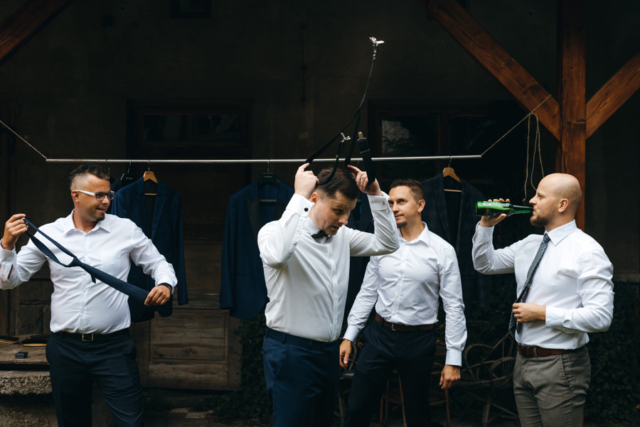 Ostatnie godziny przed ślubem i weselem w Dworze Kociołek para młoda spędziła na tradycyjnych przygotowaniach. Był to doskonałym materiał do wykorzystania w reportażu ślubnym. Tym bardziej, że Jacek wybrał na nie dość nietypowe miejsce, a mianowicie utrzymane w rustykalnym stylu podwórko. Do pomocy zaprosił też kilku kolegów. To idealny pomysł, aby ślubny reportaż był od początku inny niż wszystkie. W takich okolicznościach nawet czyszczenie butów nie musi być nudne. A gdy do tego można również strzelić piwko, uśmiechy z twarzy weselników nie schodziły.