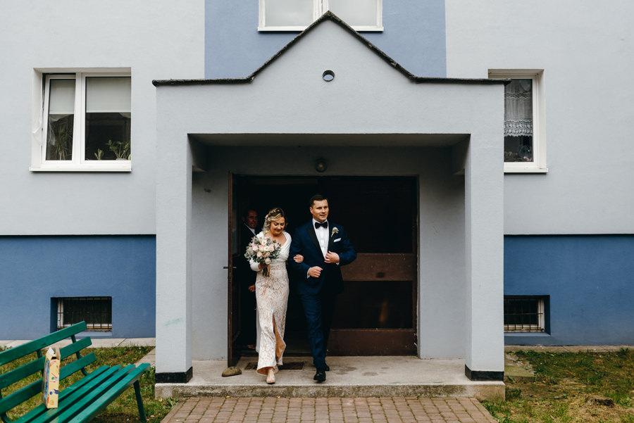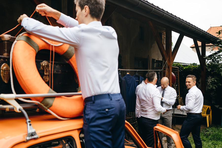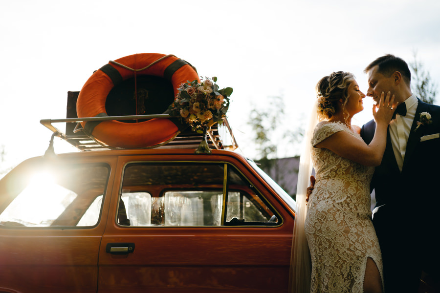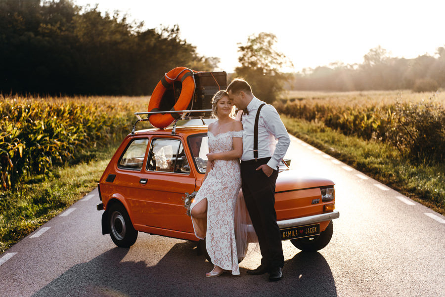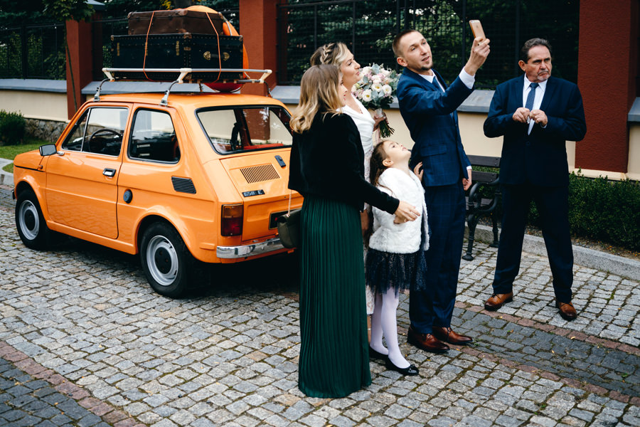 Na podwórku Jacka czekał oldschool’owy pomarańczowy maluch, o którym wspominaliśmy w poradniku pt. „Auto do Ślubu„. Para młoda miała pojechać nim do ślubu. Wiedziałem już, że dziś nie przeszkodzi nawet pochmurna pogoda, a materiał będzie świetny.