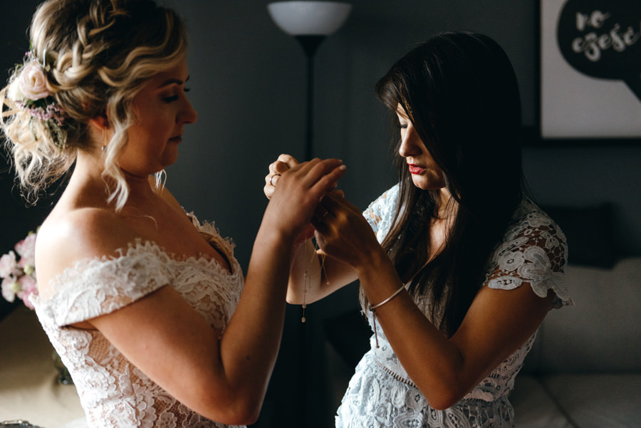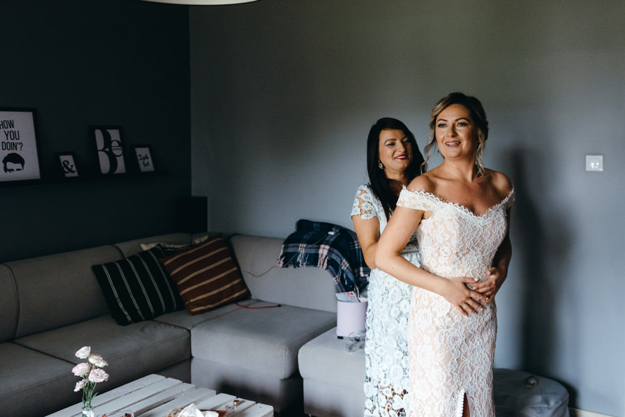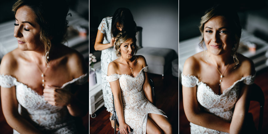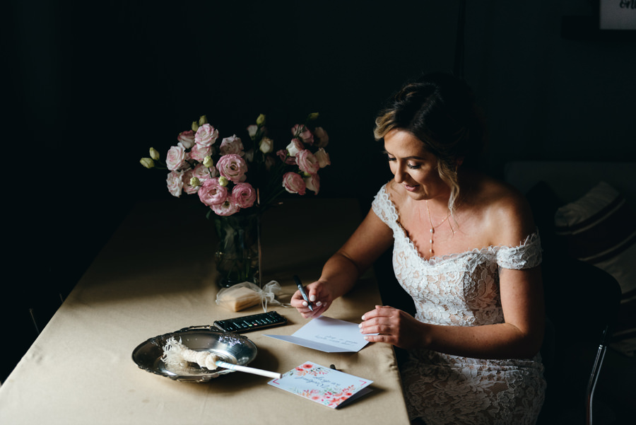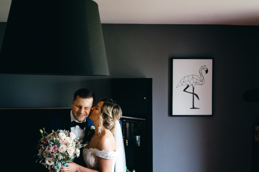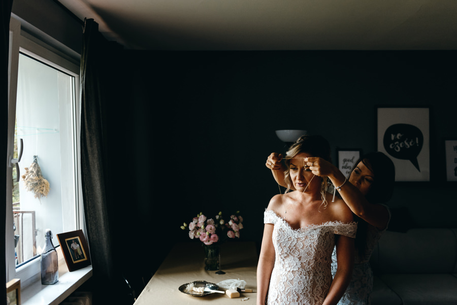 Dwór Kociołek czekał na weselnych gości, a Kamila przygotowywała się do ślubu w zaciszu swojego pokoju i w niewielkim gronie. Takie otoczenie ma równie swoje zalety dla ślubnych fotografii. Mo oddać intymność tej sytuacji.