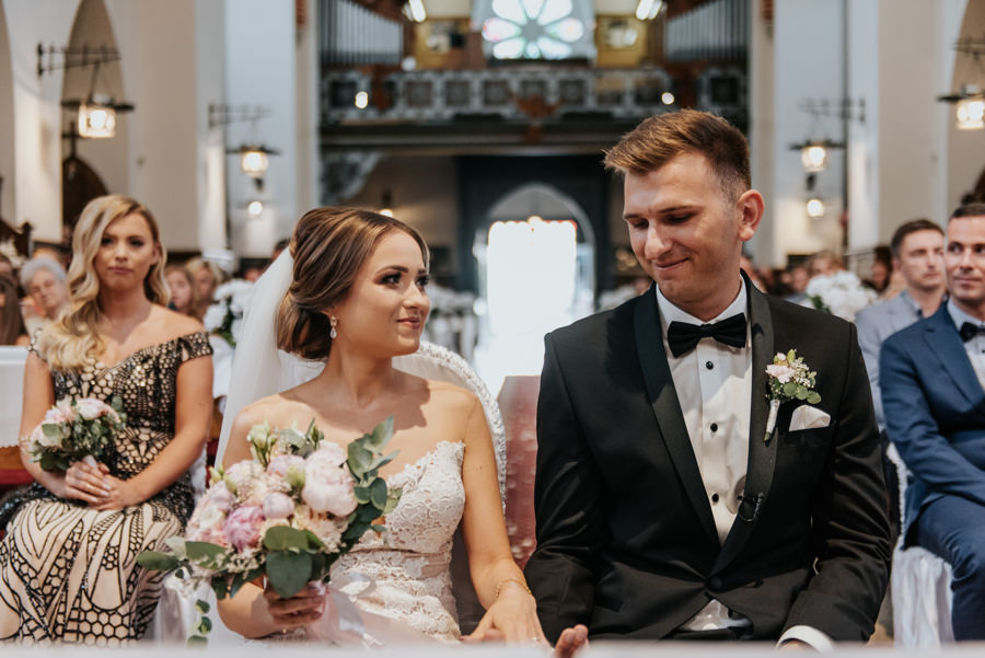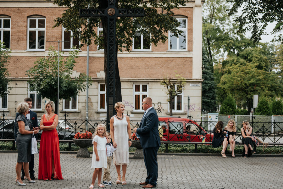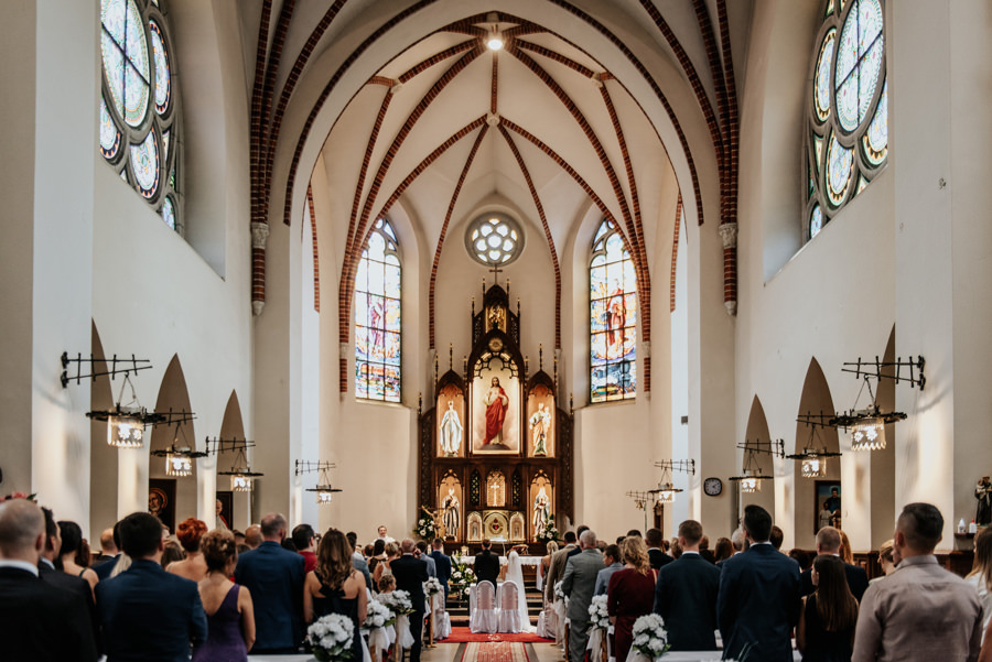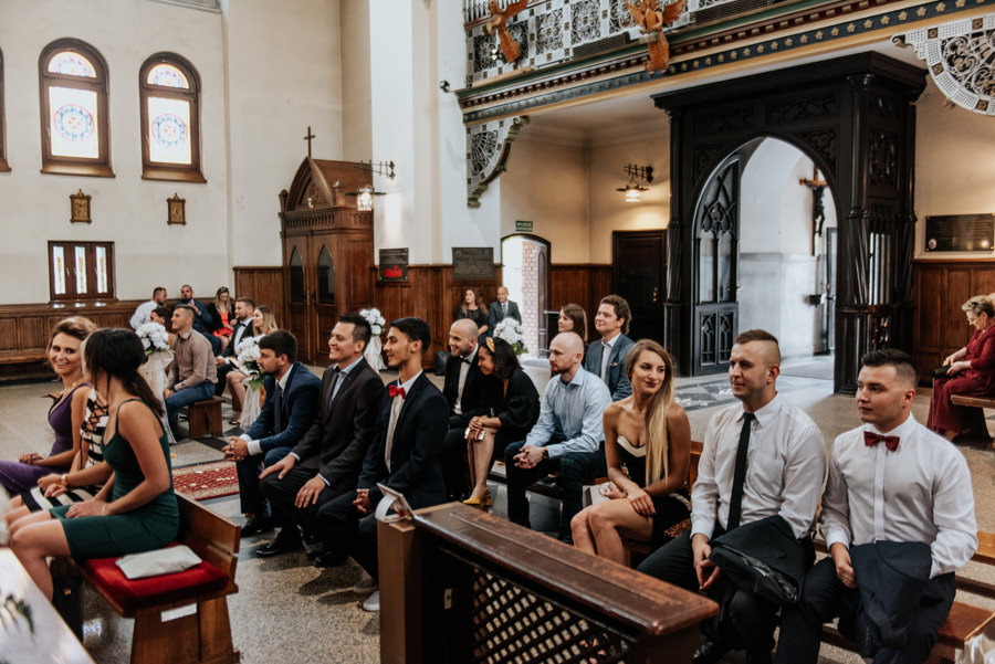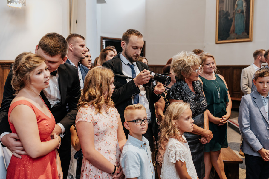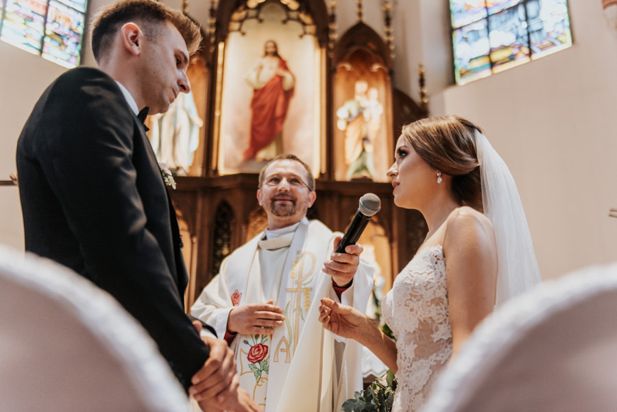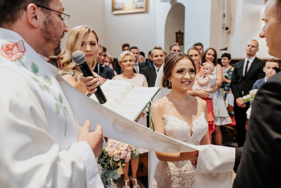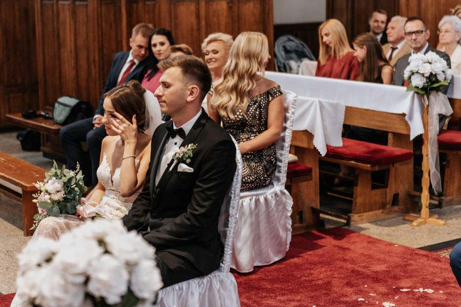 Uroczystość ślubna odbyła się w kościele Najświętszego Serca Pana Jezusa w Nowym Sączu. Tradycji stało się zadość – Pan Młody zobaczył swoją wybrankę (poprowadzoną do ołtarza przez brata) dopiero w świątyni! Przed złożeniem przysięgi Młodzi wysłuchali przepięknego kazania, a sam moment zaślubin również okazał się wyjątkowy. Ksiądz poprosił bowiem rodzinę Moniki i Tolka o zgromadzenie się przed prezbiterium. Myślę, że każdy fotograf ślubny marzy o takich, pełnych intymności i patosu, chwilach. Dzięki nim właśnie reportaż ślubny w naszym wydaniu nabiera prawdziwie indywidualnych cech.