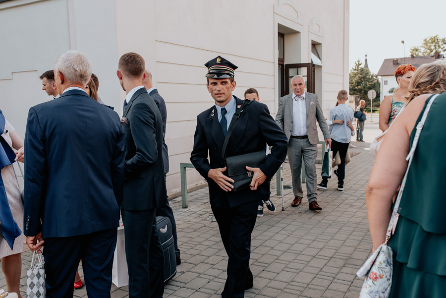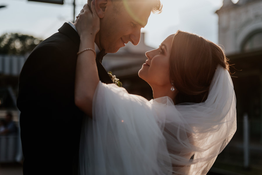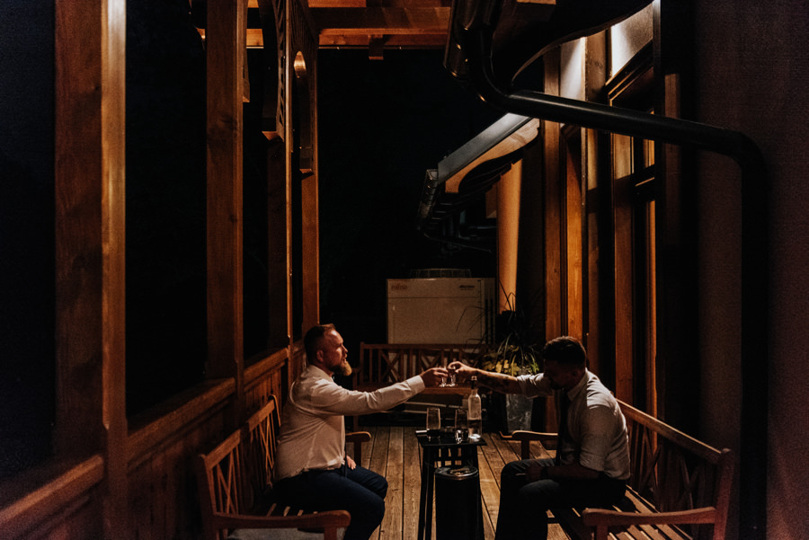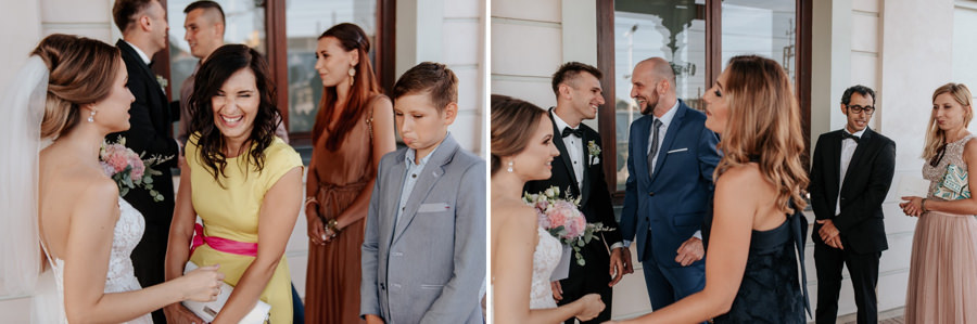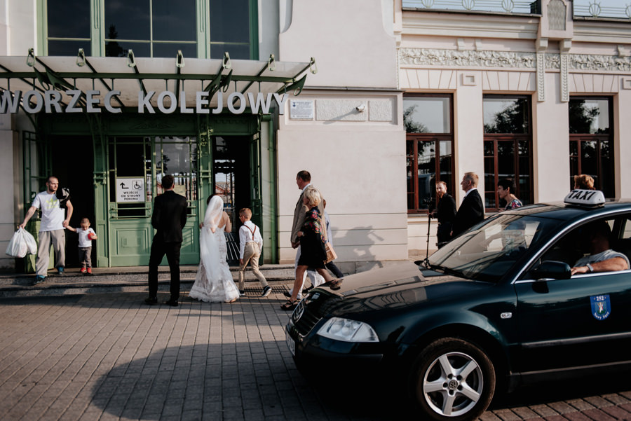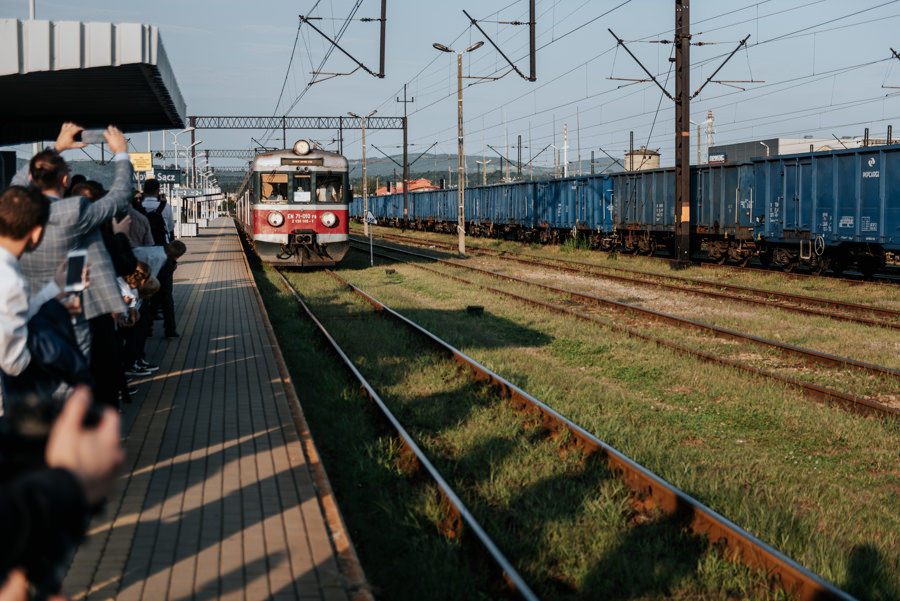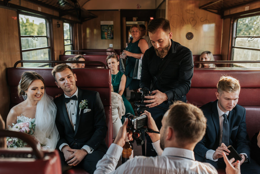 Jak się jednak okazało nie był to koniec niespodzianek. Państwo Młodzi zorganizowali transport na salę weselną pociągiem. Poprosili więc wszystkich o przejście na peron dworca PKP w Nowym Sączu, gdzie przyjęli życzenia od zgromadzonych gości. Z racji tego, że mieliśmy niewielki zapas czasu, zdecydowaliśmy się na krótką sesję plenerową w promieniach zachodzącego słońca. Po kilku chwilach pojawił się wyczekiwany pociągi i mogliśmy ruszać w drogę. Gości zaskoczył nieco groźny i surowy konduktor (w tę rolę wcielił się przyjaciel nowożeńców), który nikomu nie darował kary za brak biletu. Na całe szczęście zamiast mandatu wręczał… kieliszek, którym trzeba było spełnić toast za Młodych.