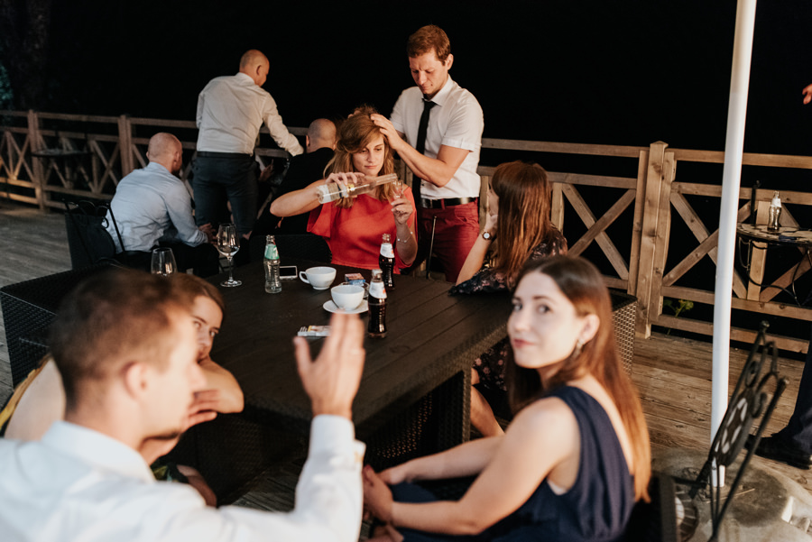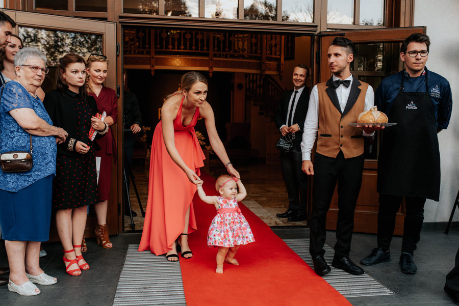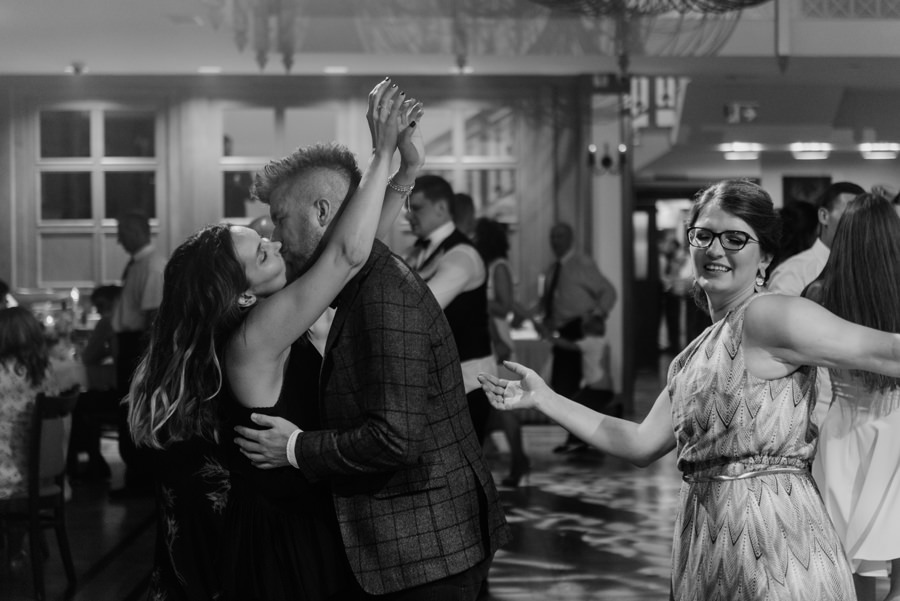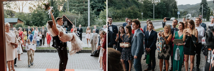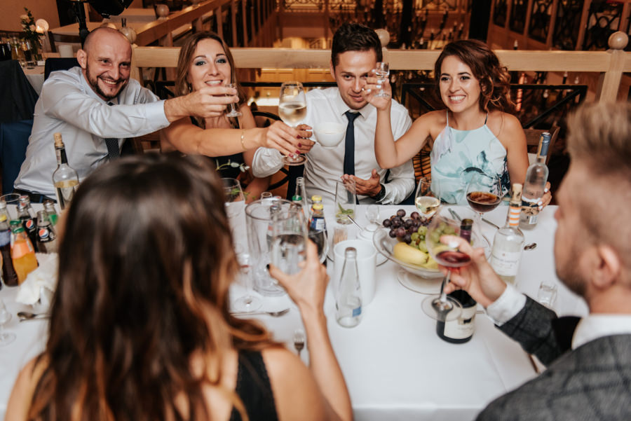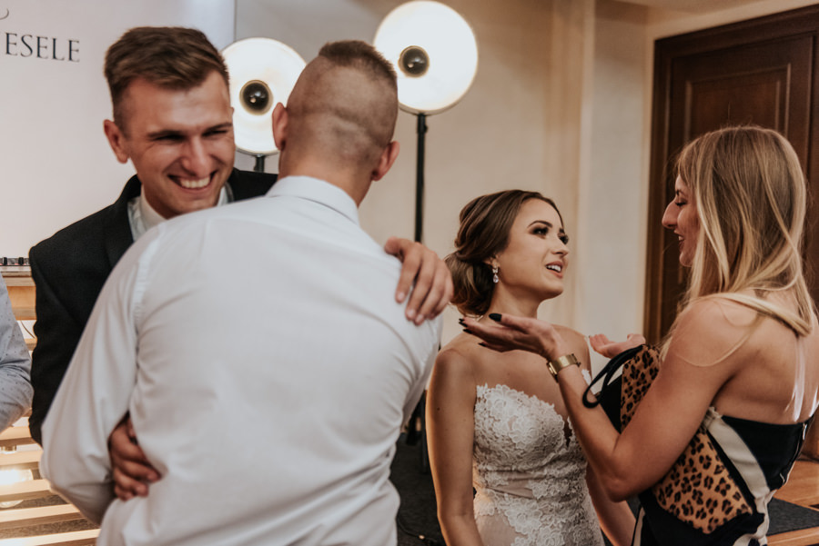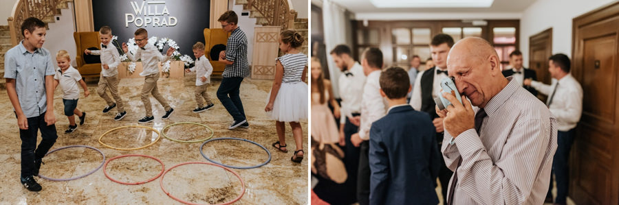 W doborowych nastrojach dotarliśmy do sali weselnej Willa Poprad, gdzie zorganizowano zabawę. Po tradycyjnym powitaniu chlebem i solą udało mi się wykonać jeszcze kilka zdjęć w plenerze. Tutaj ujawniła się ciekawa zaleta sali weselnej, a mianowicie jej malownicze położenie. Wystarczy wyjść na tyły Willi Poprad, aby znaleźć się nad wartką rzeką o tej samej nazwie. Po powrocie rzuciliśmy się w wir zabawy, ale czekała na nas jeszcze jedna niespodzianka. Oczepiny ustawiono tak, aby muchę i welon złapali: brat Moniki i jego dziewczyna. W decydującym momencie chłopak uklęknął przed swoją wybranką i poprosił ją o rękę. Mimo zaskoczenia dziewczyna powiedziała „tak”. Zabawa trwała jeszcze długie godziny, a sala weselna Willi Poprad doskonale spełniła swoje zadanie.