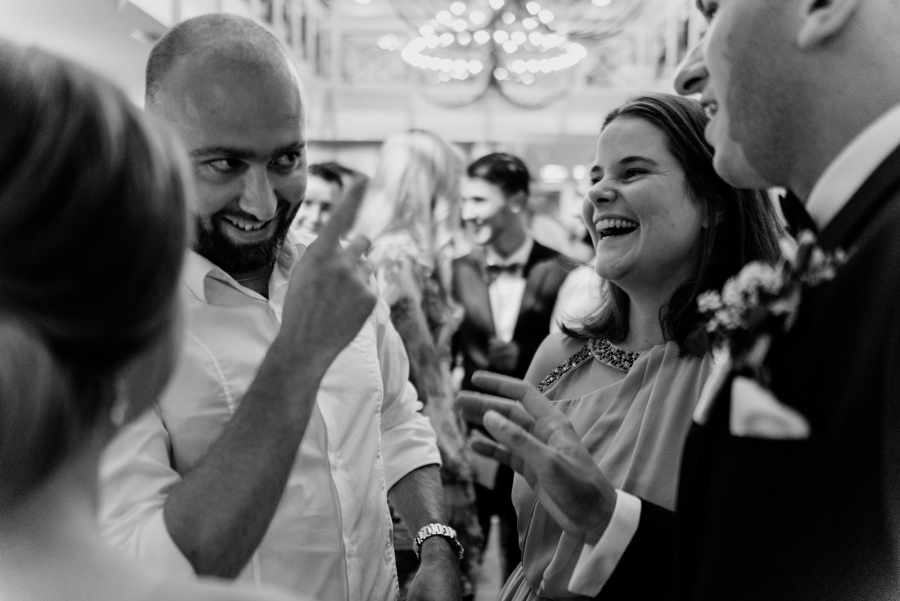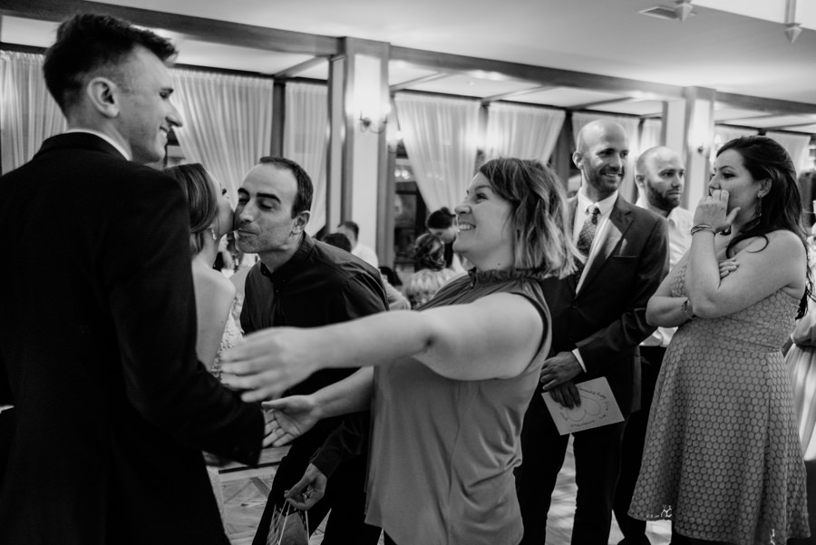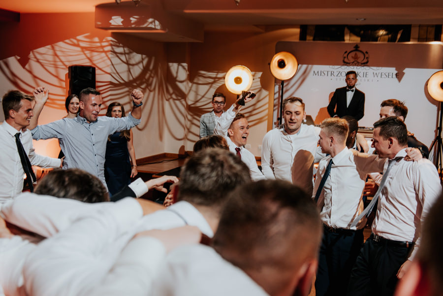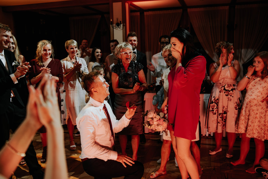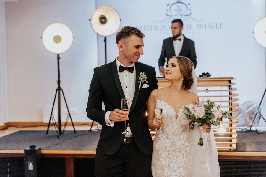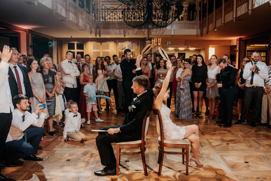 W doborowych nastrojach dotarliśmy do sali weselnej Willa Poprad, gdzie zorganizowano zabawę. Po tradycyjnym powitaniu chlebem i solą udało mi się wykonać jeszcze kilka zdjęć w plenerze. Tutaj ujawniła się ciekawa zaleta sali weselnej, a mianowicie jej malownicze położenie. Wystarczy wyjść na tyły Willi Poprad, aby znaleźć się nad wartką rzeką o tej samej nazwie. Po powrocie rzuciliśmy się w wir zabawy, ale czekała na nas jeszcze jedna niespodzianka. Oczepiny ustawiono tak, aby muchę i welon złapali: brat Moniki i jego dziewczyna. W decydującym momencie chłopak uklęknął przed swoją wybranką i poprosił ją o rękę. Mimo zaskoczenia dziewczyna powiedziała „tak”. Zabawa trwała jeszcze długie godziny, a sala weselna Willi Poprad doskonale spełniła swoje zadanie.