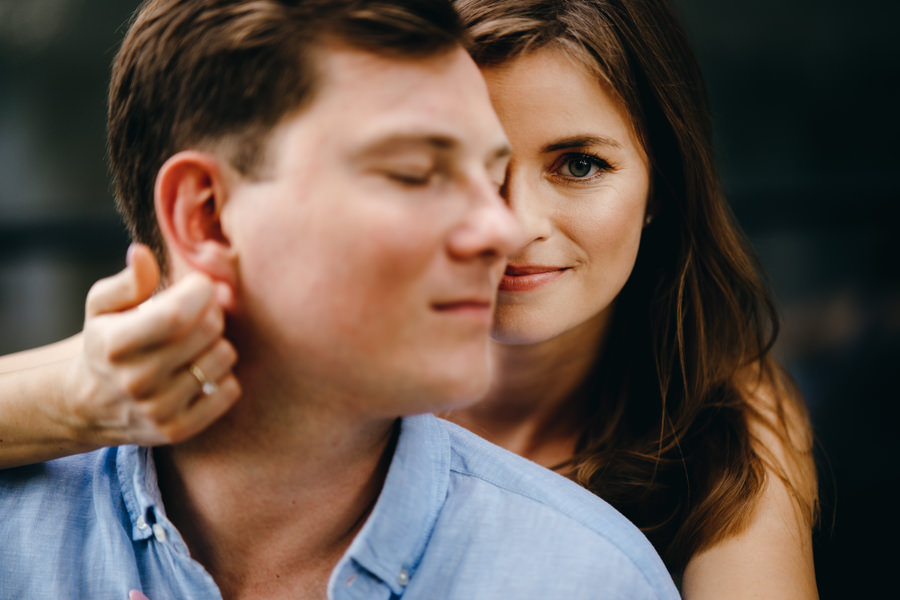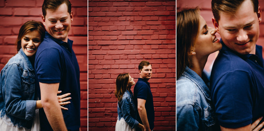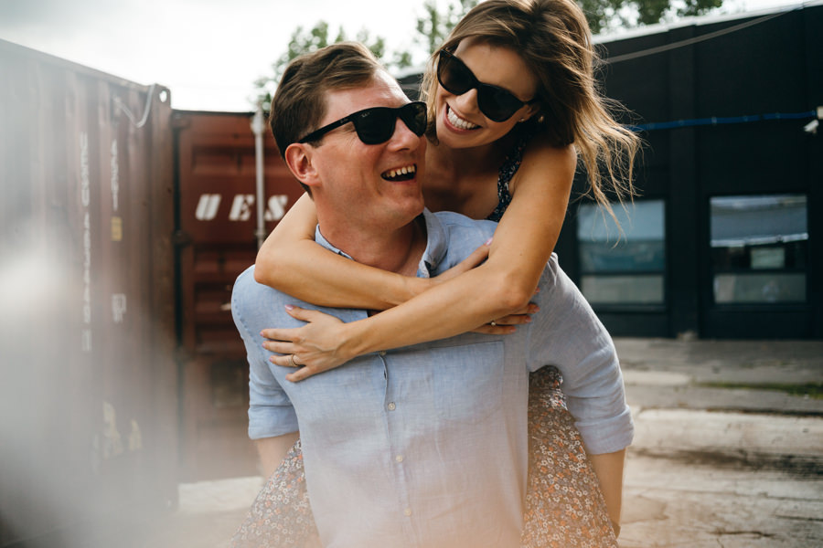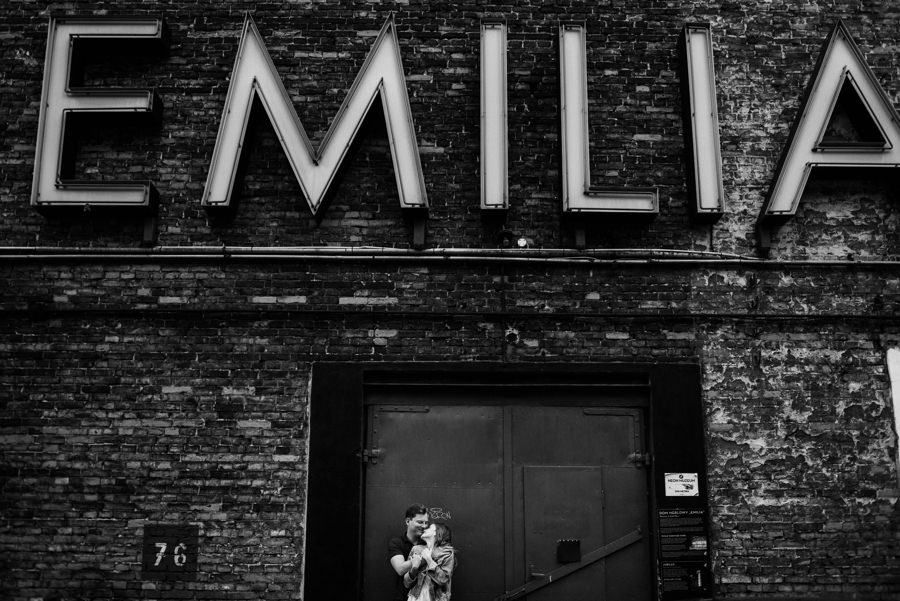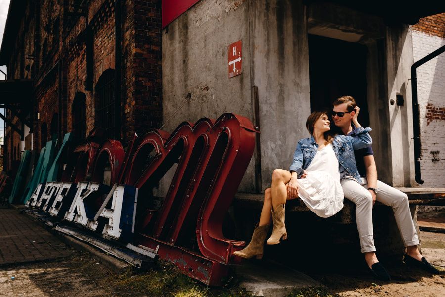 To, co z pewnością rzuci się Wam w oczy, to przebijający się ponad szarość budynków kolor czerwony. Drzwi, kontener czy ściana. Czerwień i jego wszystkie odcienie stała się kolorem tego pleneru narzeczeńskiego. Cegła i rdza kontrastowały z niebieskim niebem i czułymi kadrami zakochanych w sobie ludzi. To właśnie kwintesencja klimatu takiego industrialnego pleneru narzeczeńskiego.