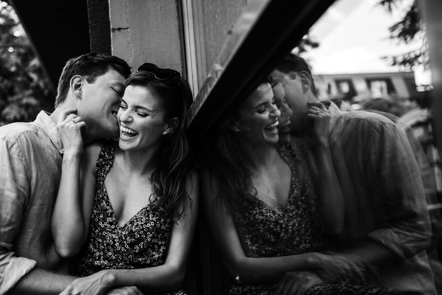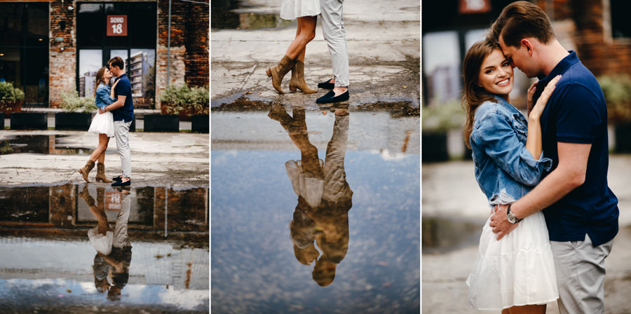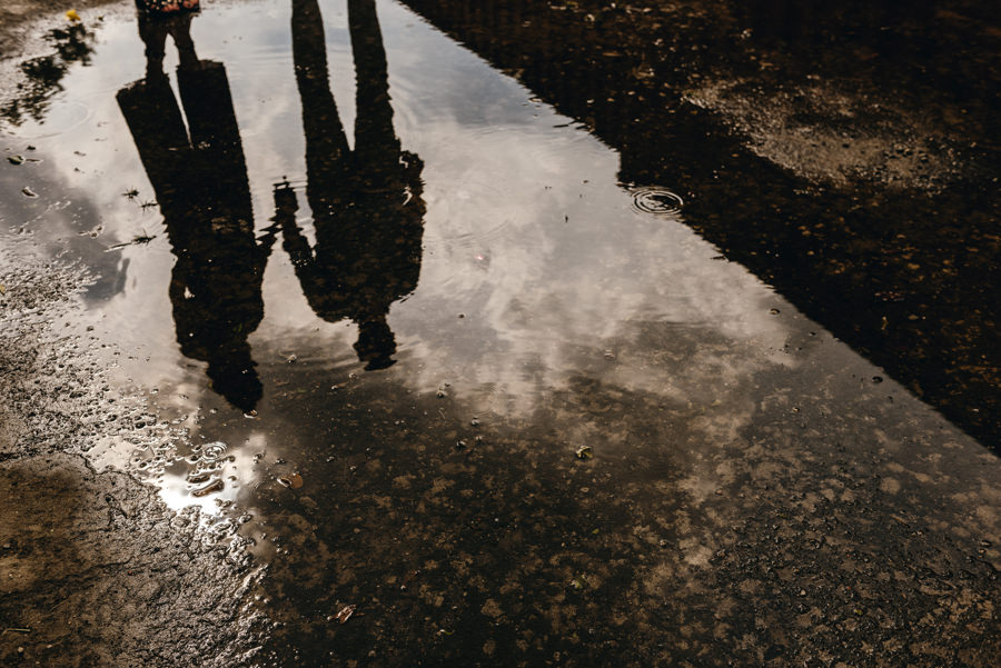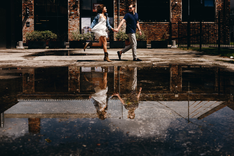 Wprawdzie nas deszcz nie zmoczył, ale musiał wcześniej padać, bo pozostawił po sobie ogromną kałużę. Idealnie pasowała do takiego miejskiego klimatu, dlatego stała się bohaterem kilku kadrów tej industrialnej sesji narzeczeńskiej.