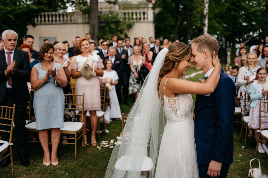 Sama ceremonia odbyła się w parku Dworu Sieraków, w cieniu zabytkowych drzew. Kwartet smyczkowy grał muzykę, przy której do ołtarza prowadził Klaudię ojciec. To właśnie tam czekał na nią Adam i razem uczestniczyliśmy wszyscy w bardzo nietypowej ceremonii.