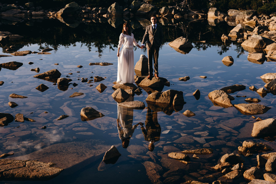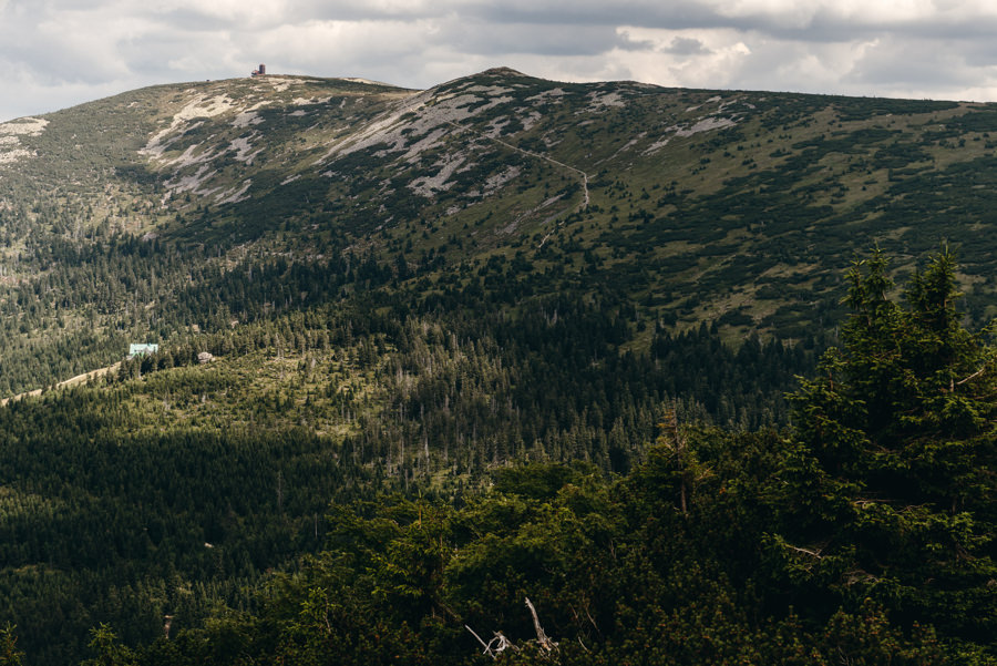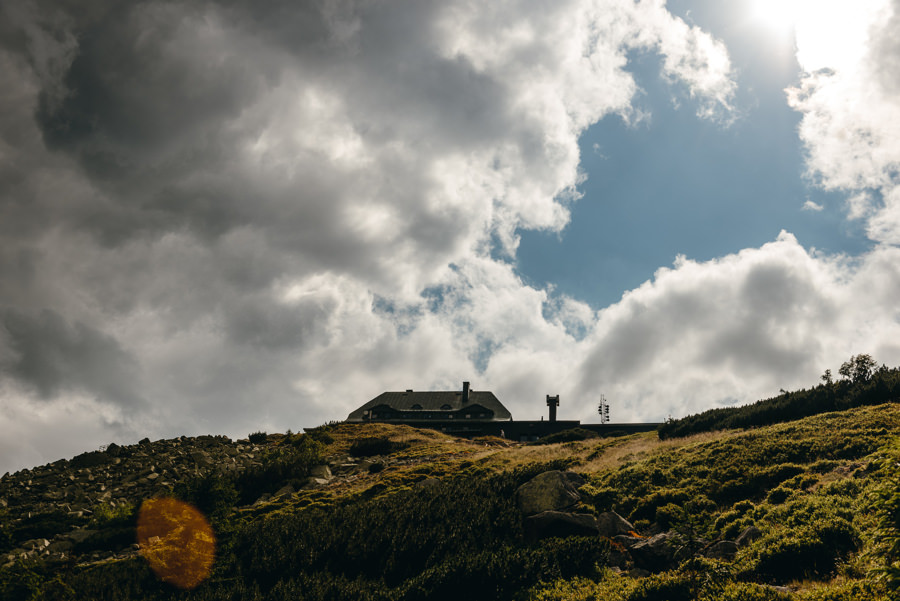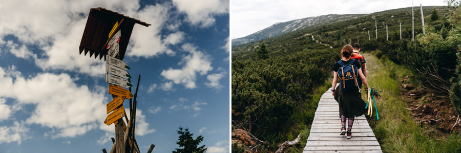 Trasa ze Szklarskiej Poręby do miejsca docelowego jest dość długa, dlatego oszczędzając siły, wykorzystaliśmy wyciąg krzesełkowy na Szrenicę. Stamtąd ruszyliśmy na szlak, aż do Śnieżnych Stawek u podnóża Śnieżnych Kotłów. W międzyczasie para młoda zamieniła sportowe stroje na ślubne, które schowane w plecakach czekały na swój debiut w górach. Cieszyłem się jak małe dziecko, bo mogłem połączyć przyjemne z pożytecznym. Dzięki Ani i Tomkowi po dziesięciu latach znów moja stopa dotknęła górskiego szlaku.