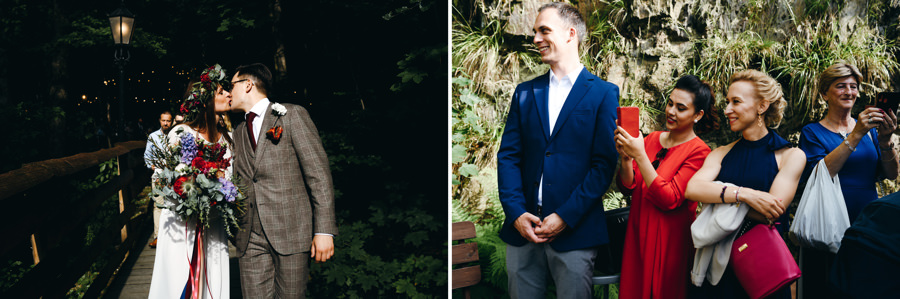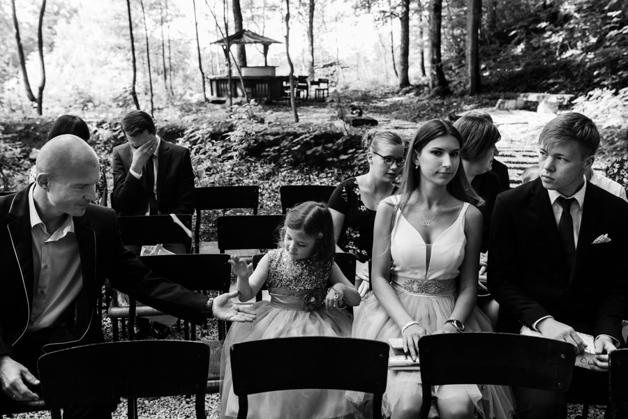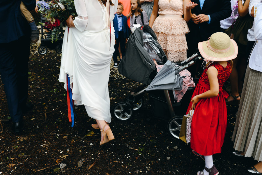 Wyobraźcie sobie, że im bliżej ceremonii, tym bardziej się przejaśniało. Do tego stopnia, że gdy Ania z Tomkiem pod koniec ceremonii wybiegli z okrzykiem radości, udało mi się złapać ich w snopie światła i powstało fajne low-key’owe, niecodzienne zdjęcie. Tak się, proszę państwa, spełnia marzenia.