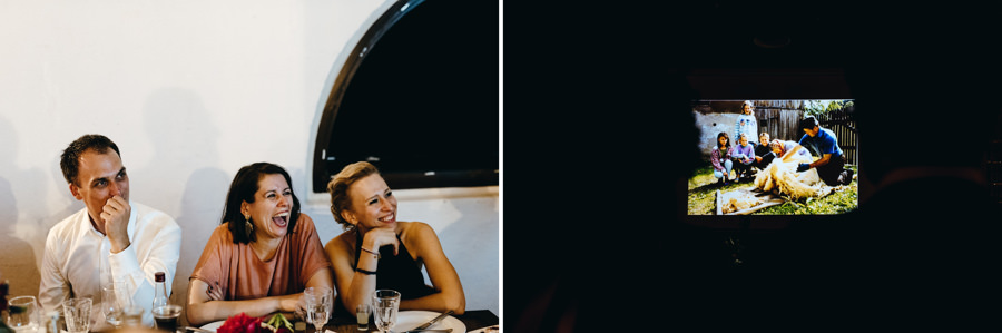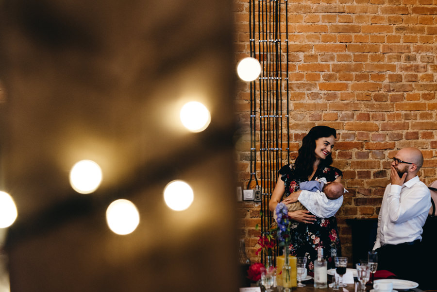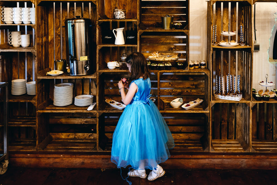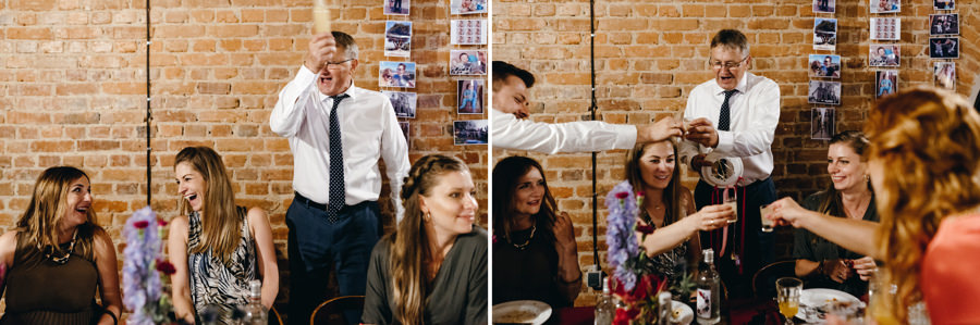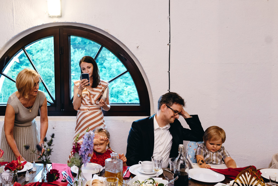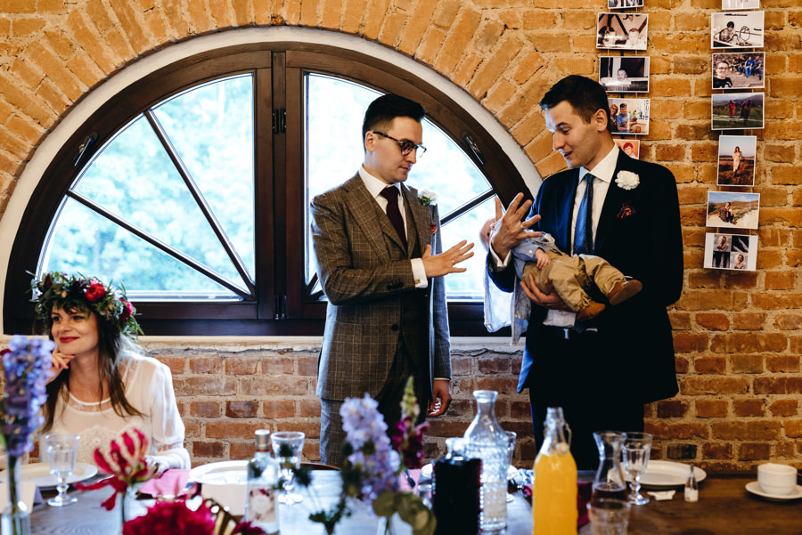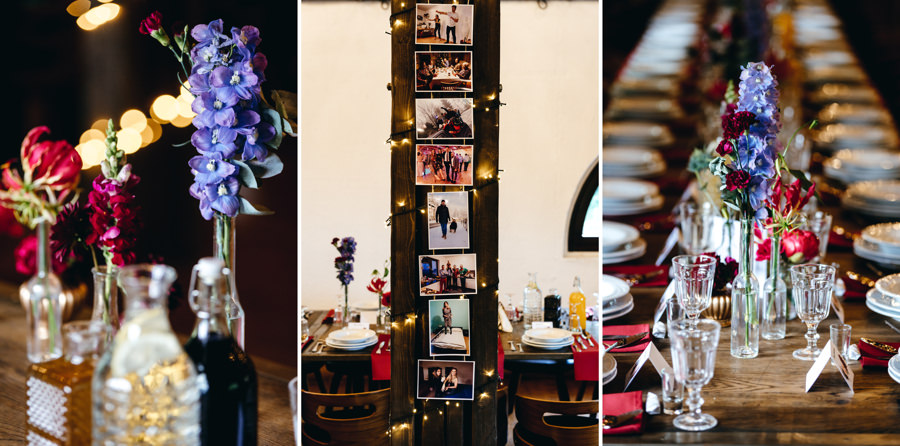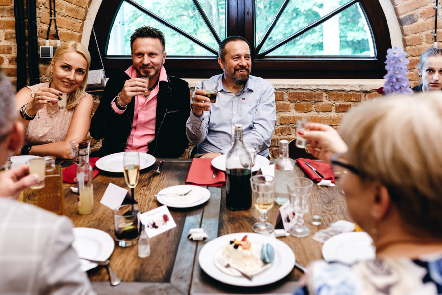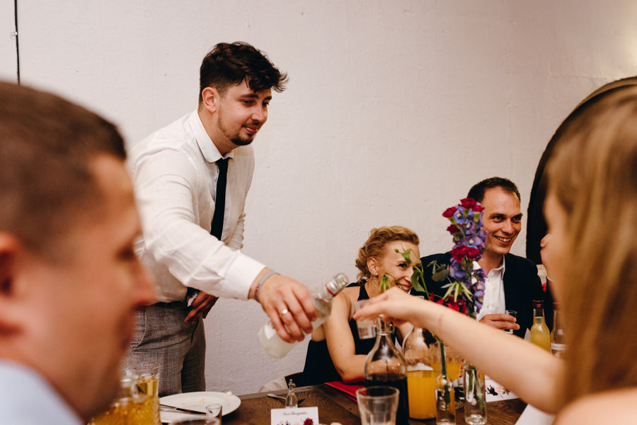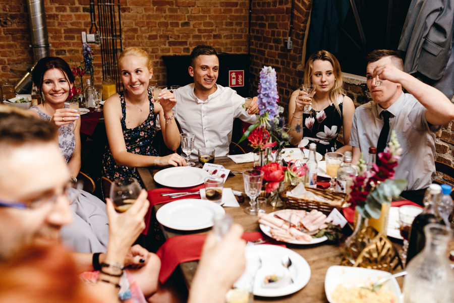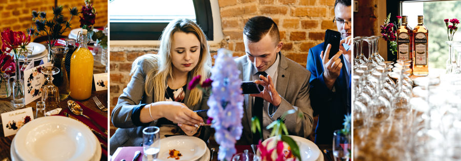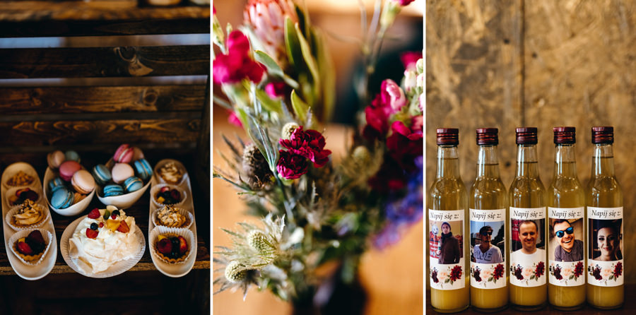 Goście zasiedli do długich drewnianych stołów, na których znajdowały się multikolorowe kwiaty w naczyniach o różnych kształtach i formach. Do tego piękna zastawa, długie kolorowe serwety i kwiatowa papeteria ślubna. Na ceglanych ścianach zawieszono zdjęcia przedstawiające historię pary młodej, od czasów becikowych po współczesne. Humorystyczny akcent można było znaleźć na bufecie z napojami. Stały tam butelki z naklejonymi etykietami z wizerunkiem gości i napisem „napij się z Kazikiem”. No i jak tu się nie napić ;). Nie mówię, że skorzystałem, ale goście chętni pili ze swoimi znajomymi ;).