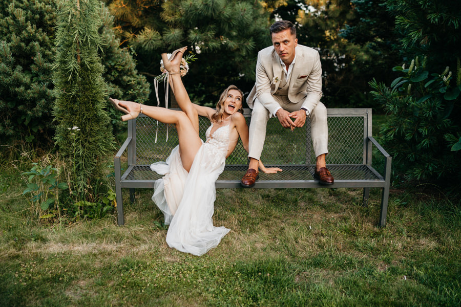 Właśnie takie warunki do zdjęć miałem podczas tego przyjęcia. I dlatego para chętnie pozowała do zdjęć z gośćmi. Powstały tradycyjne portrety, ale i szalone fotki z przyjaciółmi. A na koniec romantyczne, ale i pełne energii zdjęcia samej młodej pary. Ogród w Brzoskwini sprawdzi się zatem jako miejsce na plenerowy ślub i wesele w namiocie oraz jako lokalizacja na plener ślubny.
