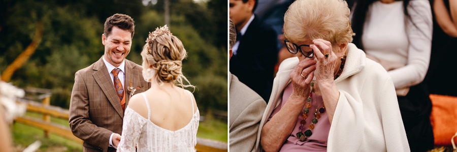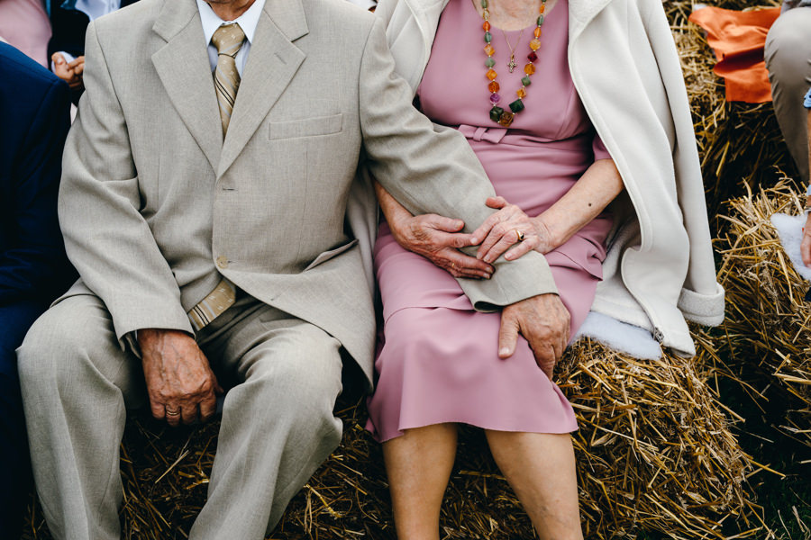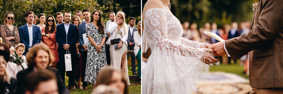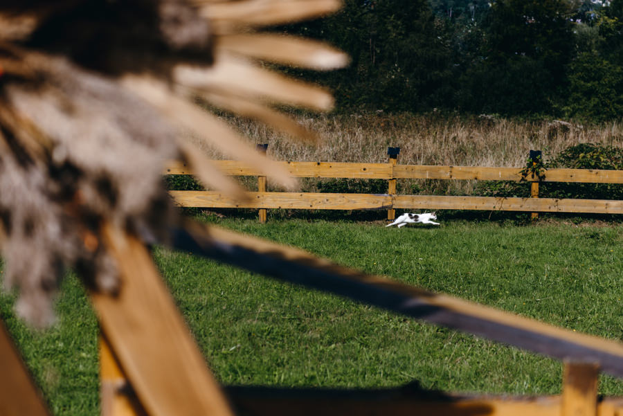 Niewiele dalej, na polanie z widokiem na pobliskie wzgórza i łąki, znajdowało się miejsce ślubu. Genialnie usytuowane, bowiem para młoda składając sobie tekst przysięgi, miała z jednej strony widok na swoich bliskim, a z drugiej – na dalekie przestrzenie. No ale jak jesteś fotografką ślubną, to potrafisz zorganizować ślub tak, by był on atrakcyjny wizualnie. A to zapewnia klimat w dniu uroczystości i estetyczną pamiątkę na lata. Sprytnie, prawda ;).