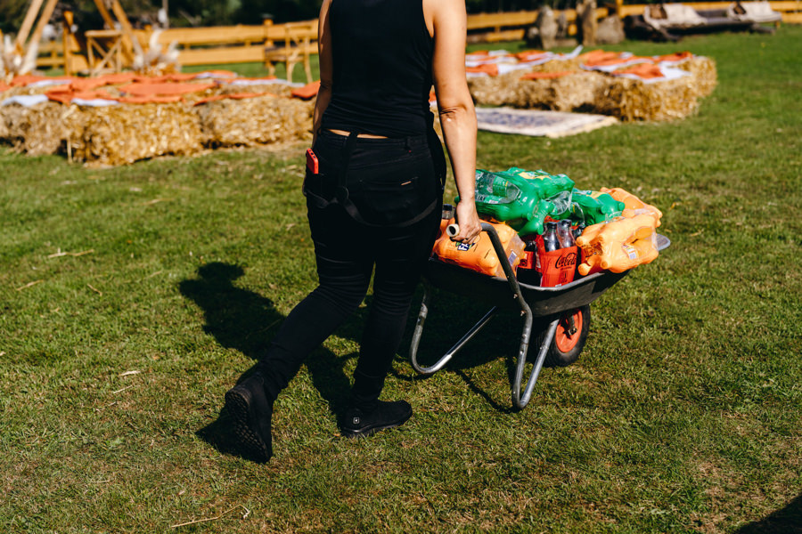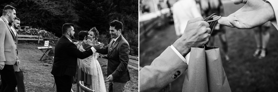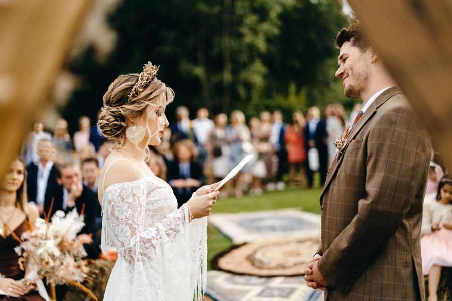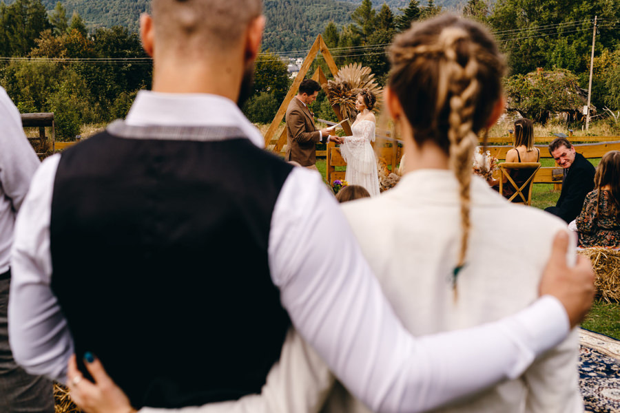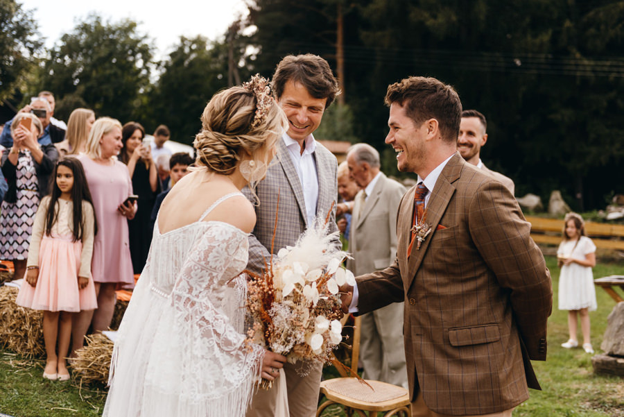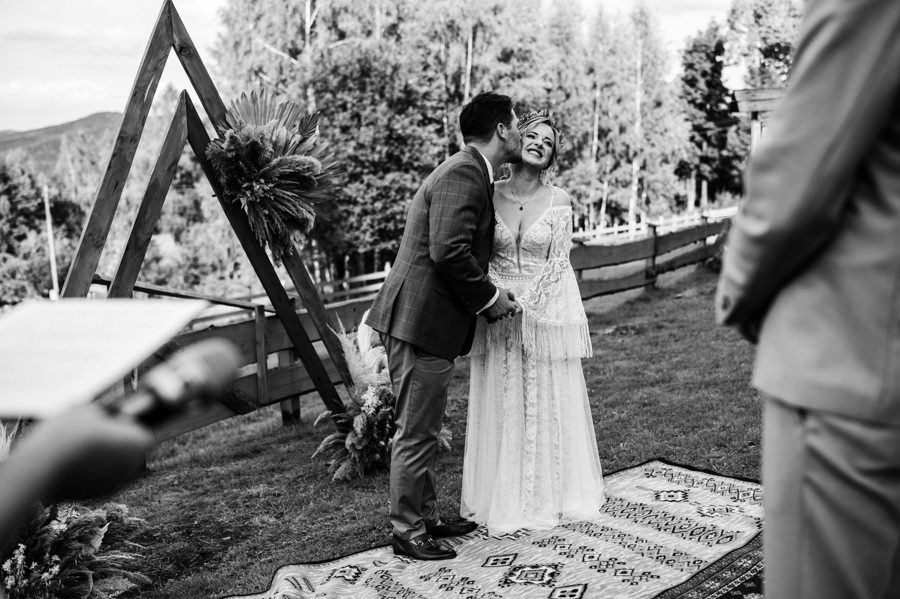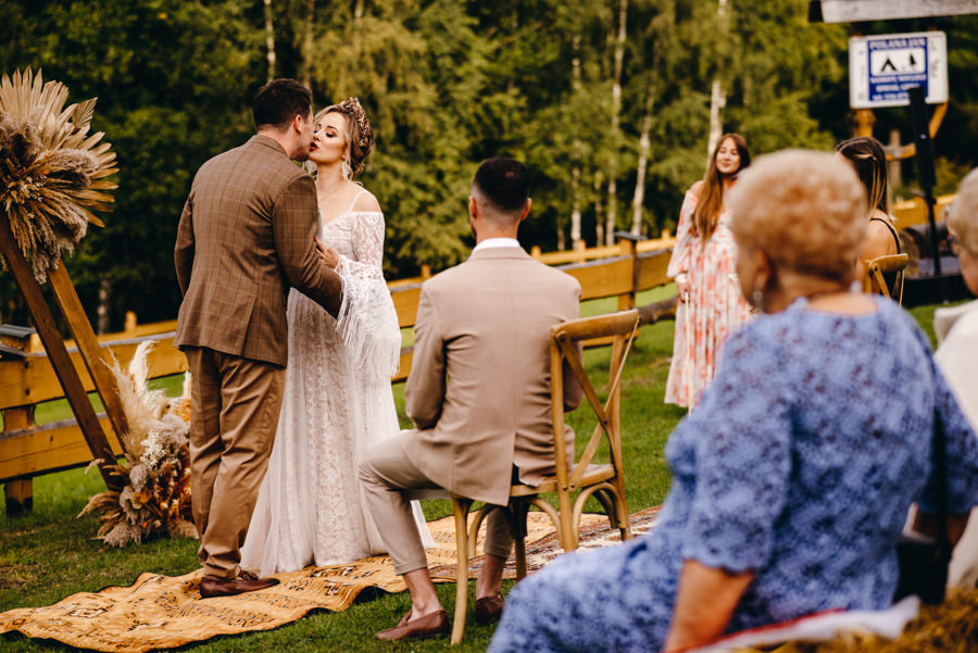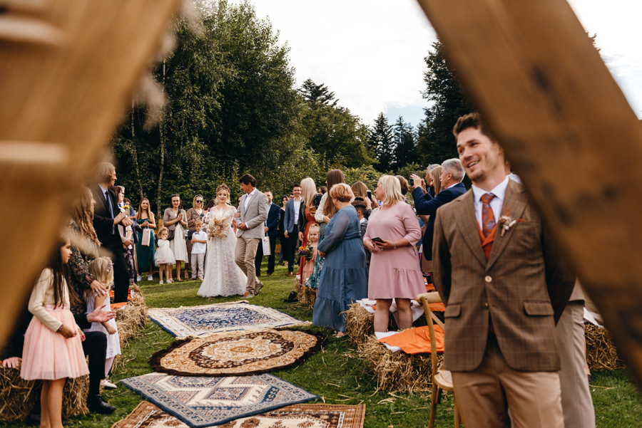 Na uwagę zasługuje także boho aranżacja przestrzeni miejsca ceremonii. Za całość odpowiadała para młoda i ich przyjaciele. Rolę ołtarza tworzyła drewniana konstrukcja wykonana przez Karola i świadka. Całość stylizacji uzupełniały boho dywany, na których stała para młoda podczas ceremonii i bele siana z kocami jako siedziska dla gości. A wszystkie te dekoracje stworzyła panna młoda wraz ze swoimi przyjaciółkami. Należy się im szacun za to, że zdołali sami ogarnąć taki boho klimat. Dzięki temu miejsce ceremonii nabrało fajnego klimatu.