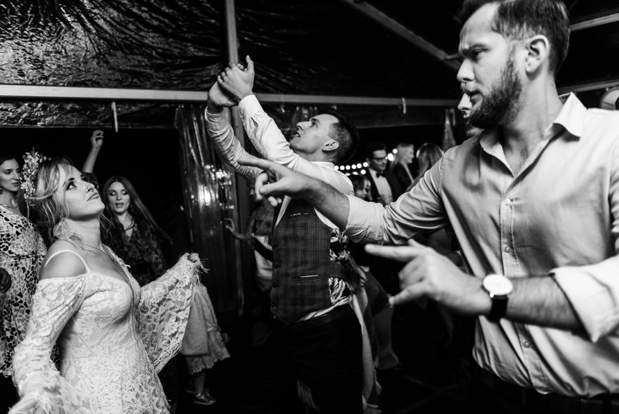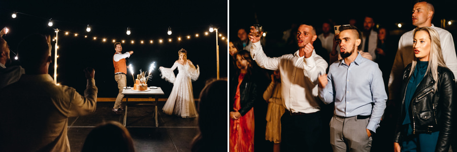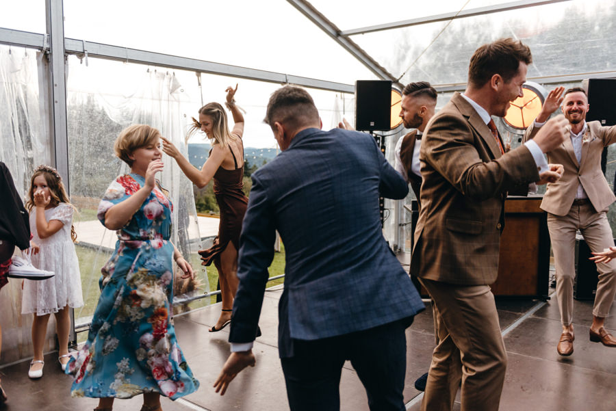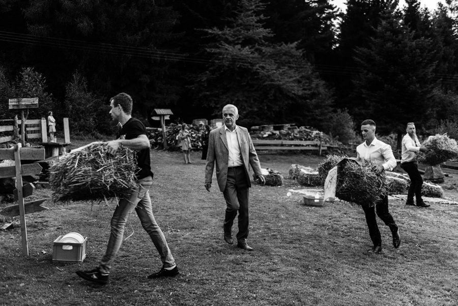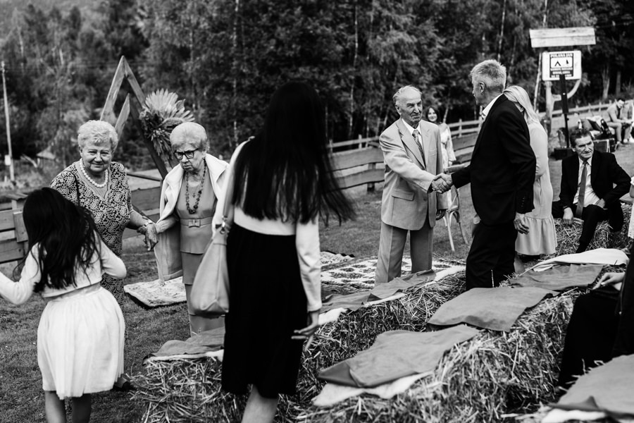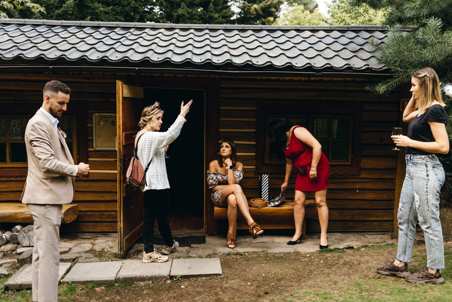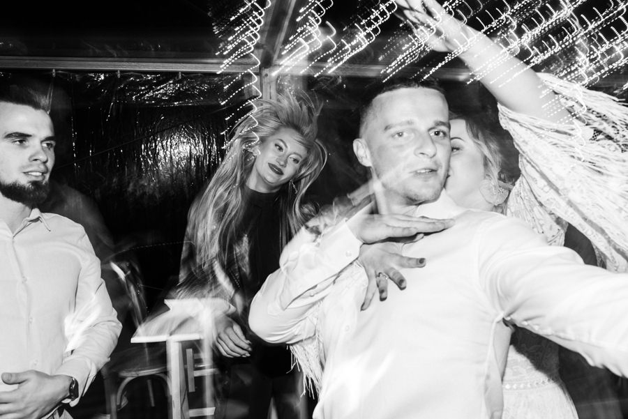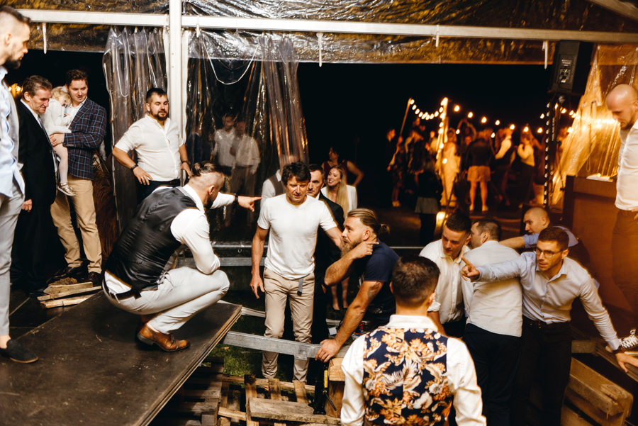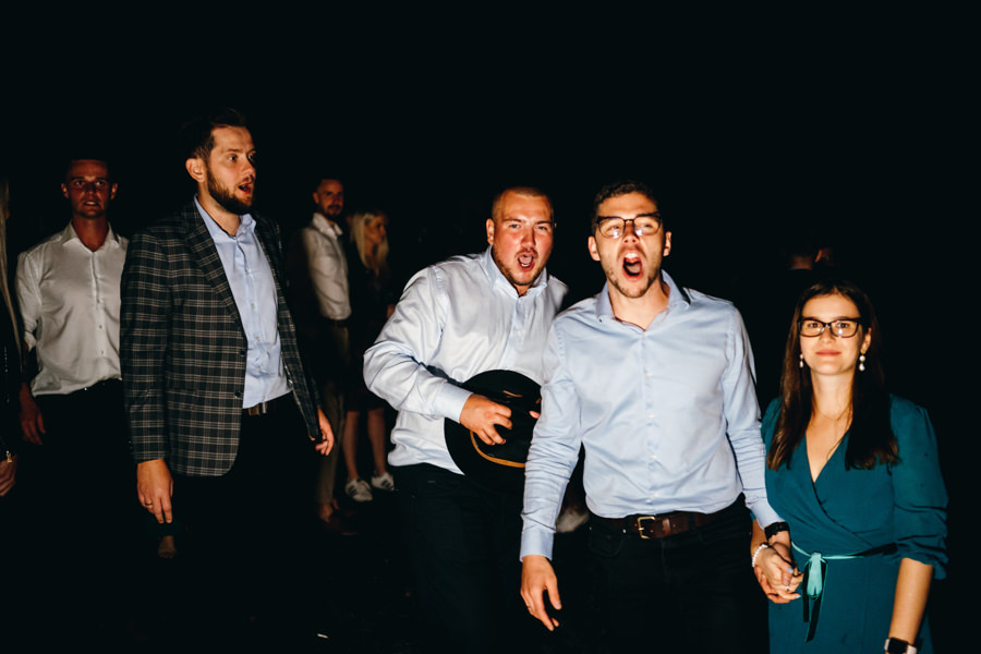 Widać, że Asia mocno kombinowała, by wesele dobrze się fotografowało. Ale duża w tym też zasługa gości, którzy podkręceni przez świetnie bawiącego ich Dj-a, potrafili wykrzesać z siebie nieograniczone pokłady energii. Do tego stopnia, że cała podłoga w namiocie trzęsła się, aż nie wytrzymała i trzeba było naprawiać parkiet. Czy to powstrzymało gości? Absolutnie nie! Przenieśli się na trawę i na drugi podest do tańca, szalejąc dalej. A wszystko to podczas letniej ciepłej nocy gdzieś w Beskidach.