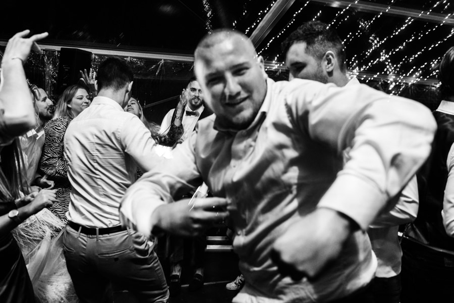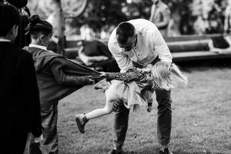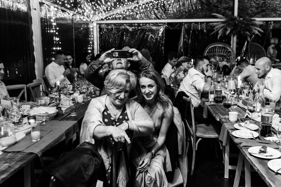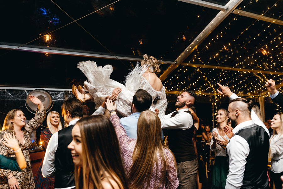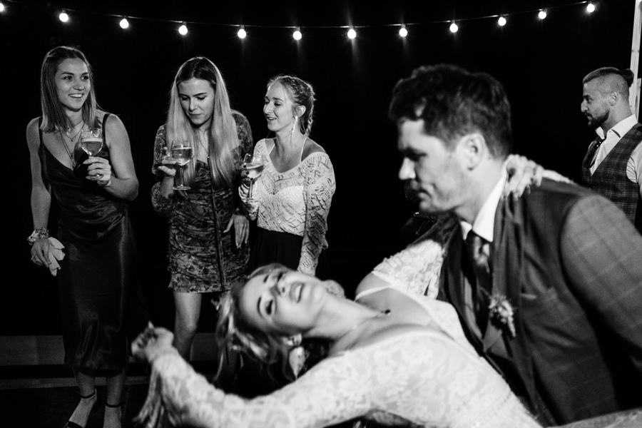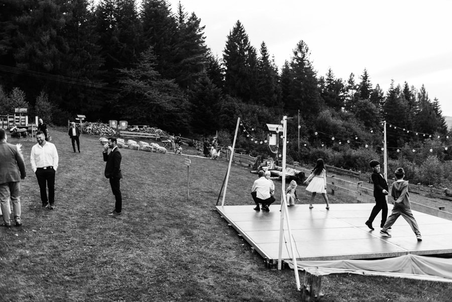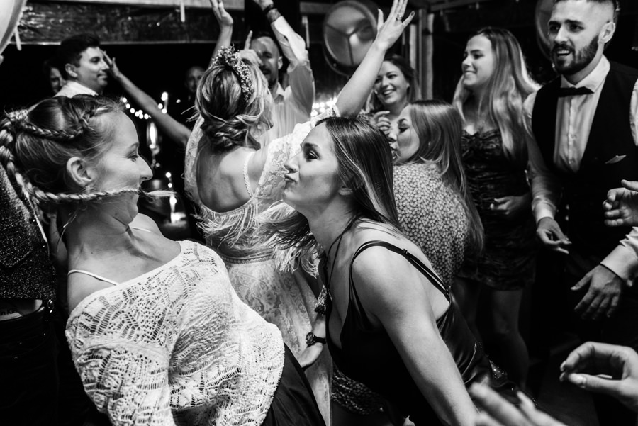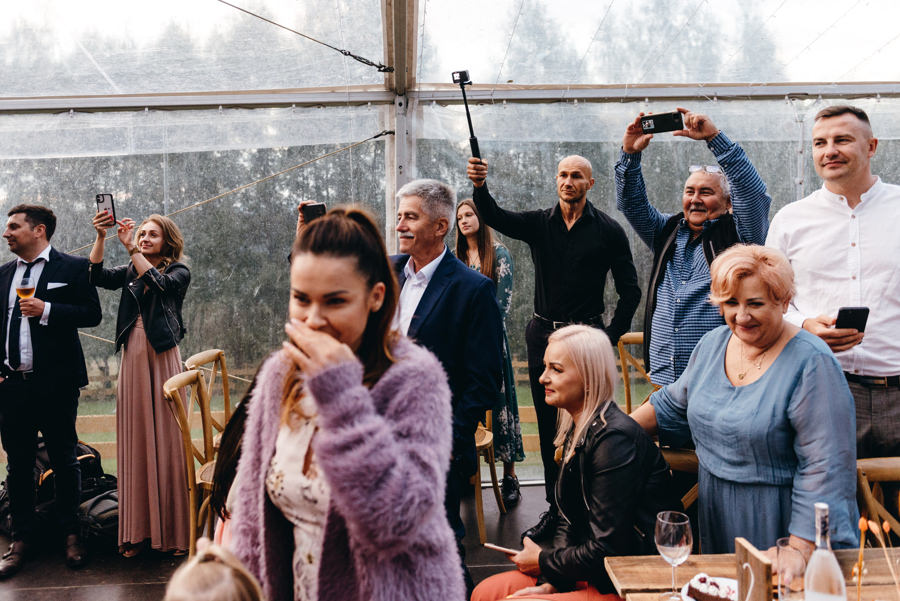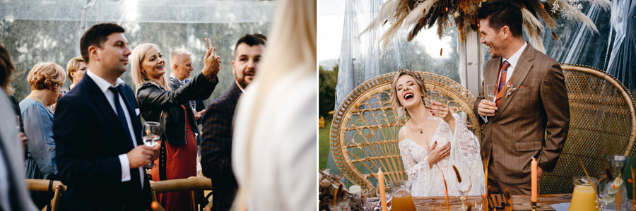 Widać, że Asia mocno kombinowała, by wesele dobrze się fotografowało. Ale duża w tym też zasługa gości, którzy podkręceni przez świetnie bawiącego ich Dj-a, potrafili wykrzesać z siebie nieograniczone pokłady energii. Do tego stopnia, że cała podłoga w namiocie trzęsła się, aż nie wytrzymała i trzeba było naprawiać parkiet. Czy to powstrzymało gości? Absolutnie nie! Przenieśli się na trawę i na drugi podest do tańca, szalejąc dalej. A wszystko to podczas letniej ciepłej nocy gdzieś w Beskidach.