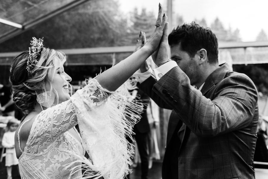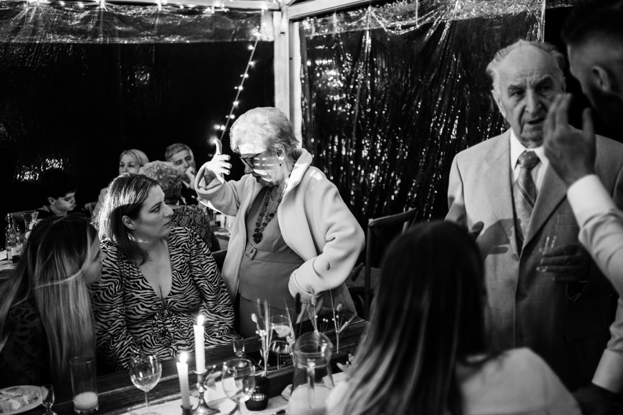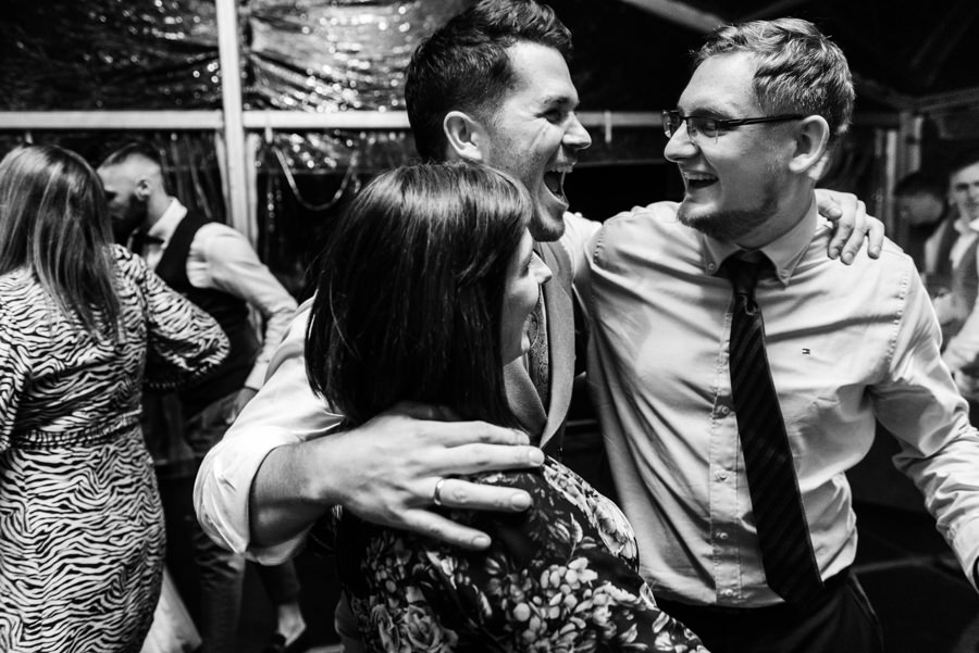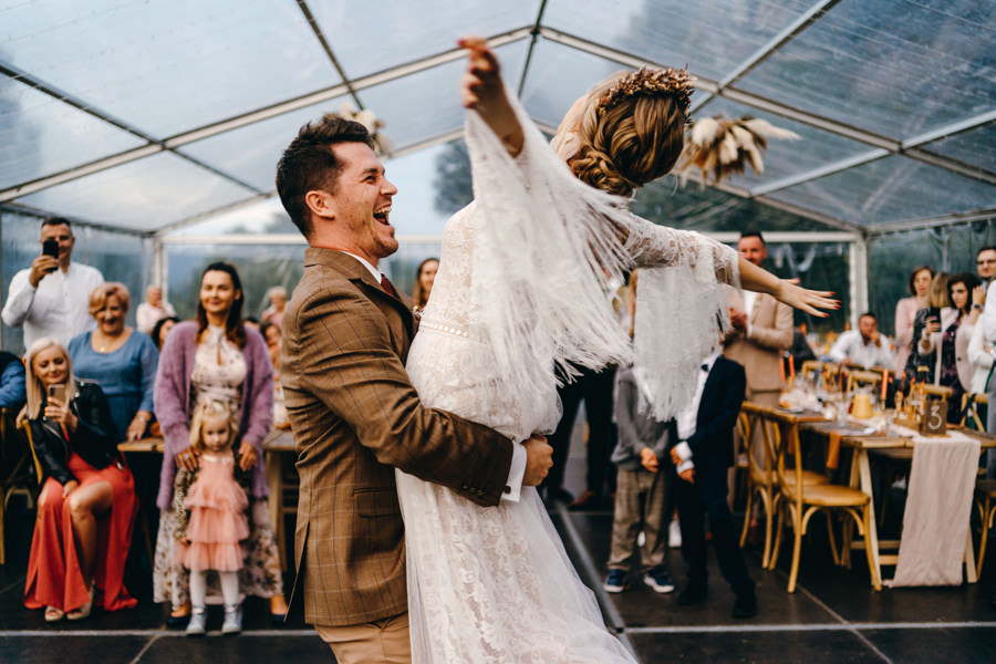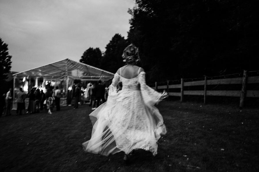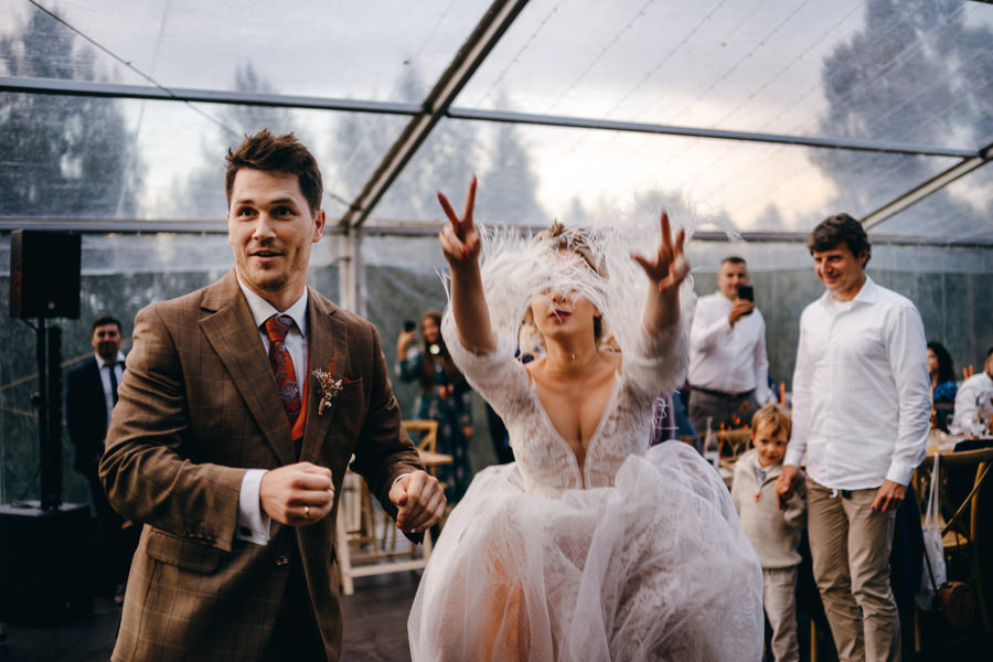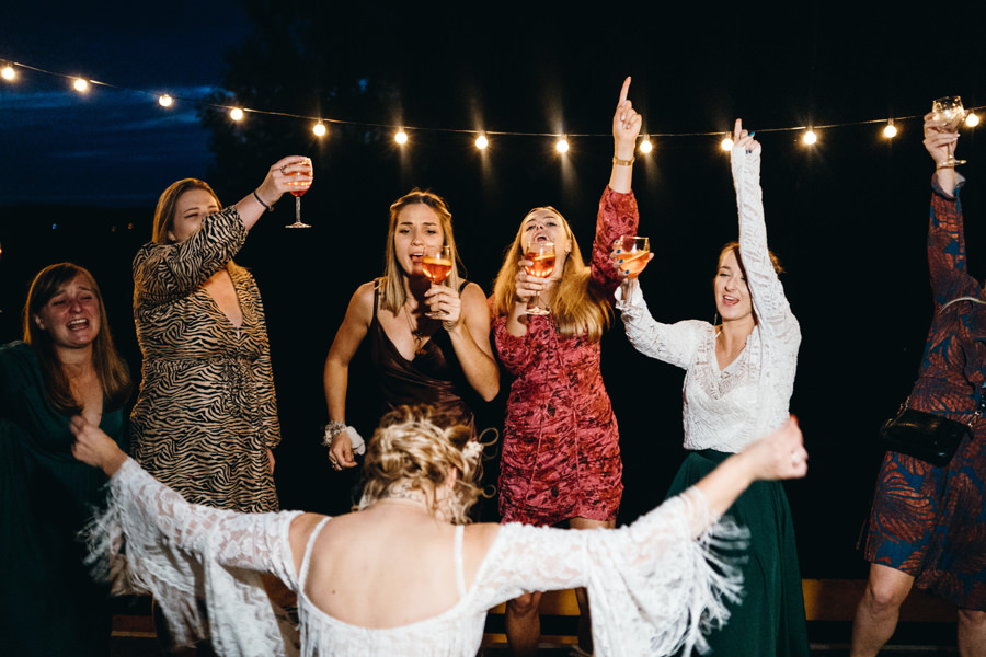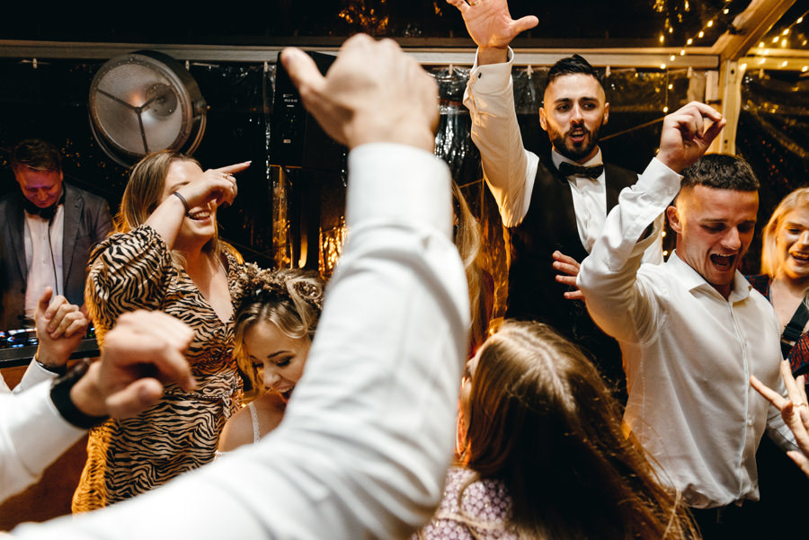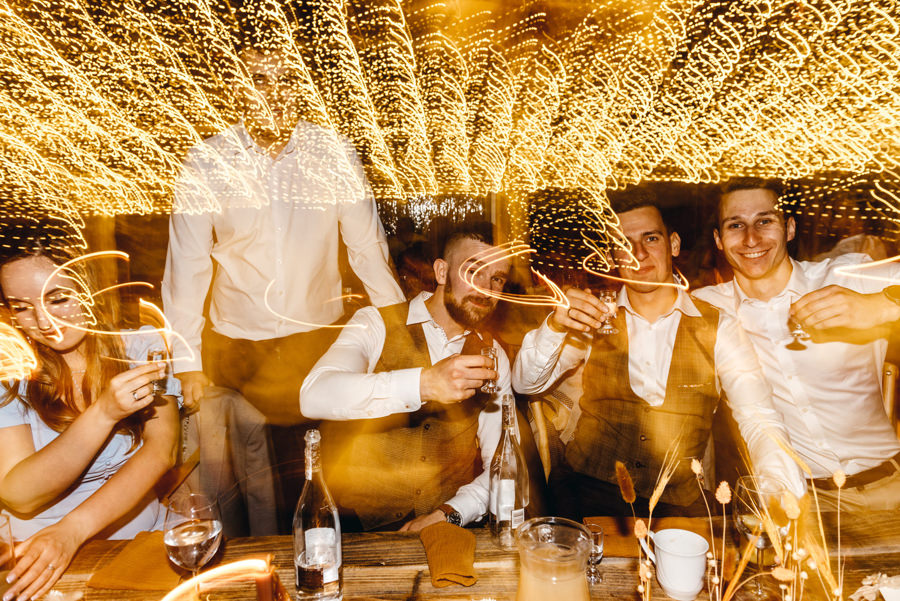 Widać, że Asia mocno kombinowała, by wesele dobrze się fotografowało. Ale duża w tym też zasługa gości, którzy podkręceni przez świetnie bawiącego ich Dj-a, potrafili wykrzesać z siebie nieograniczone pokłady energii. Do tego stopnia, że cała podłoga w namiocie trzęsła się, aż nie wytrzymała i trzeba było naprawiać parkiet. Czy to powstrzymało gości? Absolutnie nie! Przenieśli się na trawę i na drugi podest do tańca, szalejąc dalej. A wszystko to podczas letniej ciepłej nocy gdzieś w Beskidach.