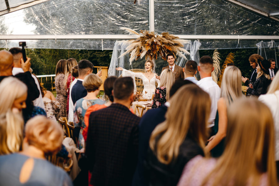 Nie uwierzycie, ale ten cały boho klimat to zasługa panny młodej. To właśnie Asia jest miłośniczką tego naturalnego stylu. Jako fotografka przemyca go w swoich zdjęciach, na swoich plenerach i w swoim życiu. Jako totalna bohomaniaczka musiała także na własnym weselu stworzyć klimat łączący luz i naturę. I wyszło jej to świetnie. Szczególnie na podziw zasługuje to, że była nie tylko pomysłodawczynią, ale i wykonawcą tych wszystkich dekoracji. Tak, te boho kompozycje to jej zasługa. Wspólnie ze swoimi przyjaciółkami w transparentnym namiocie stworzyły boho klimat z własnoręcznie zrobionych kompozycji z suszu. Do tego dodały świece, serwety i drewniane dodatki. Wszystko w kolorach ziemi – od ochry, po beże, brązy i pastele. Wyszło obłędnie.