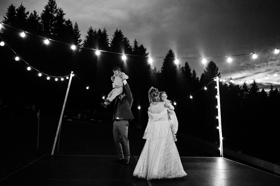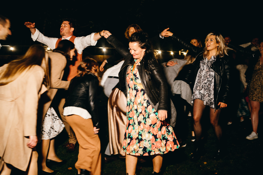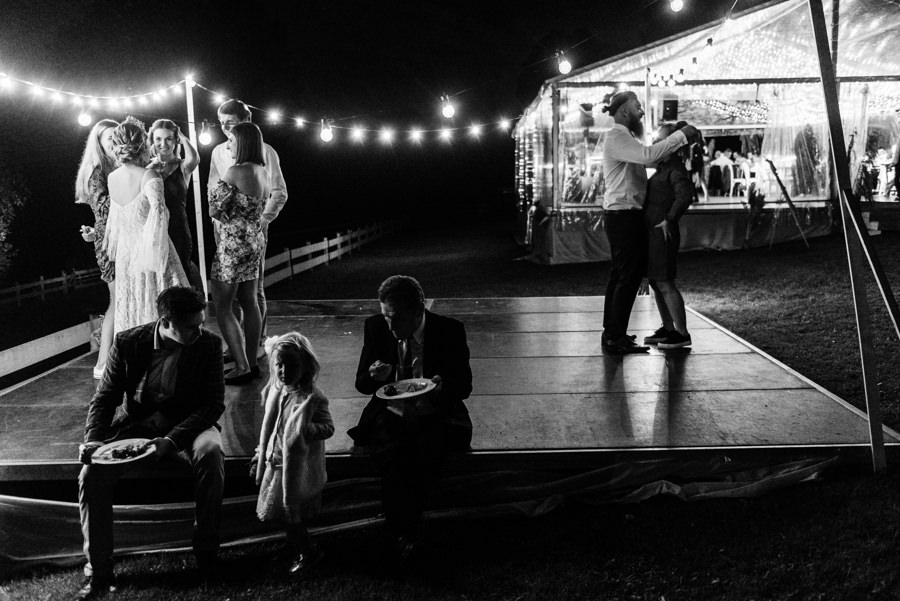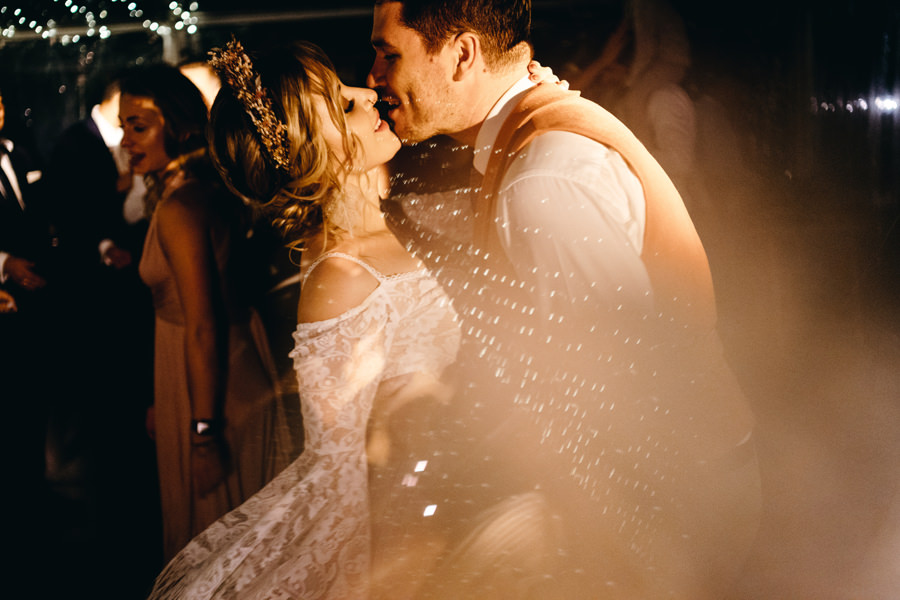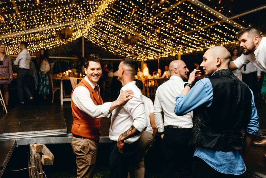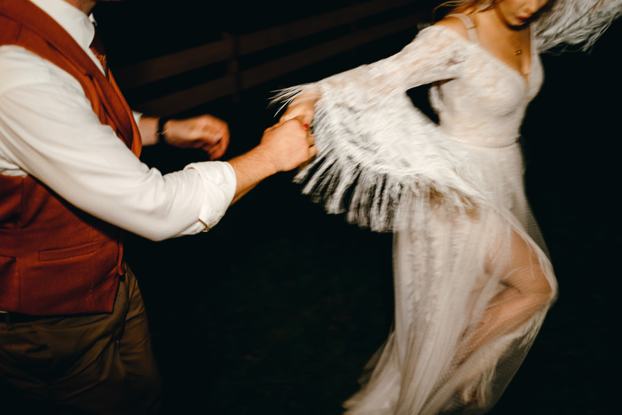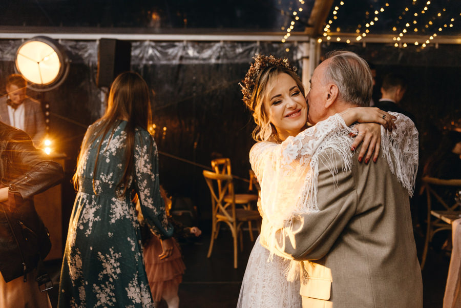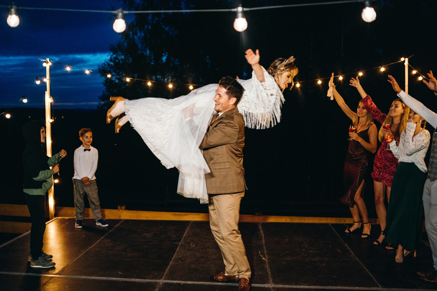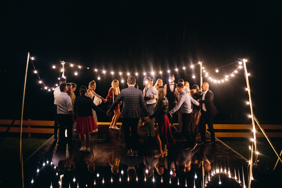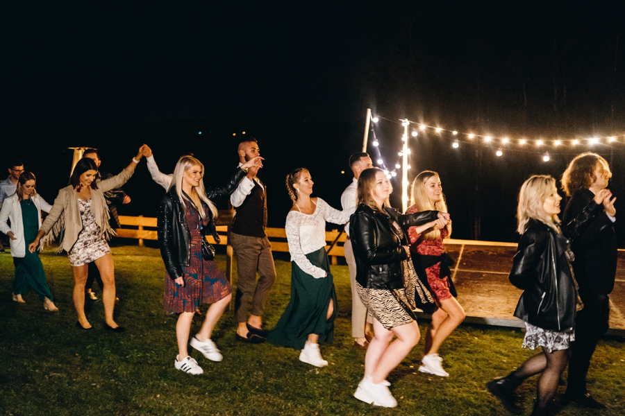 Ogólnie cała przestrzeń była świetnie zaaranżowana, a poszczególne elementy bardzo dobrze przemyślane. Jeden parkiet znajdował się pod namiotem rozświetlonym lampkami, a drugi pośrodku polany, oświetlony był girlandą żarówkową. Dawało to wiele możliwości sfotografowania gości podczas tańca i zabawy światłem.