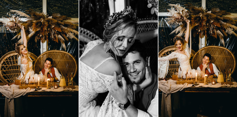 Na uwagę zasługuje także czadowy stół pary młodej, przy którym siedzieli tylko Asia i Karol na królewskich boho krzesłach zwanych peacockami. Powstała przy nim krótka sesja pary podczas wesela, bo oboje wyglądali zjawiskowo, a w połączeniu z tą aranżacją kojarzyli mi się z królami boho stylu!
